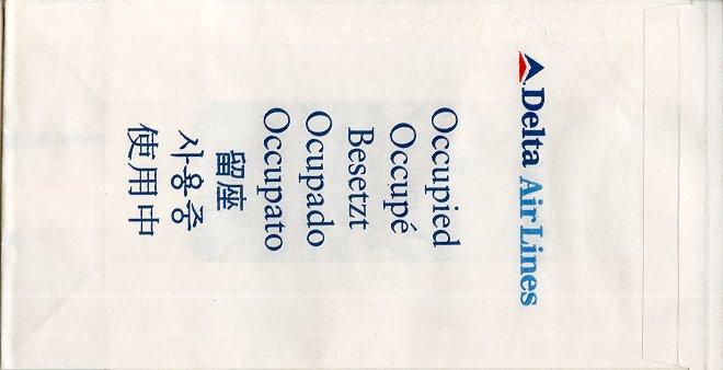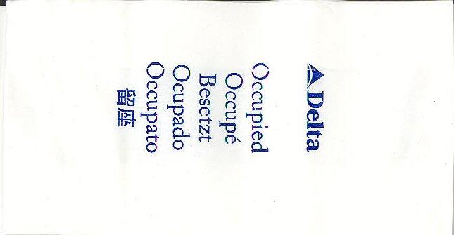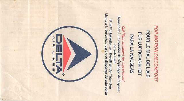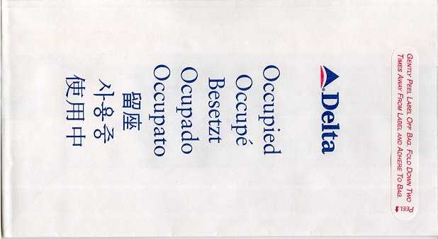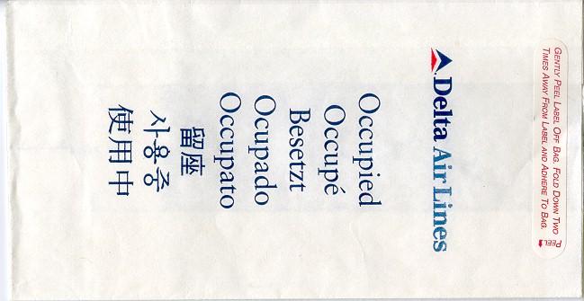 Lines 4A nice firm bag from Delta, similar to my Delta Air Lines 1 but the text "Air Lines" removed. Plastic coating inside and peel off label. Doubles as seat occupied marker in eight languages. Thanks to Steve James Delta Air