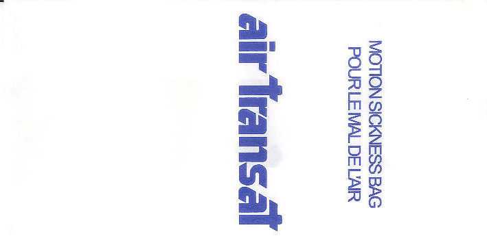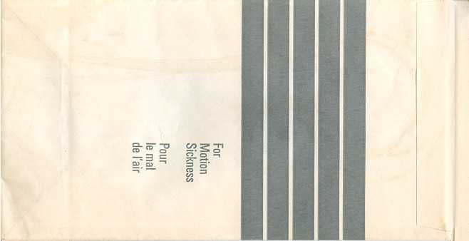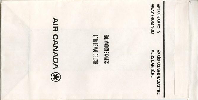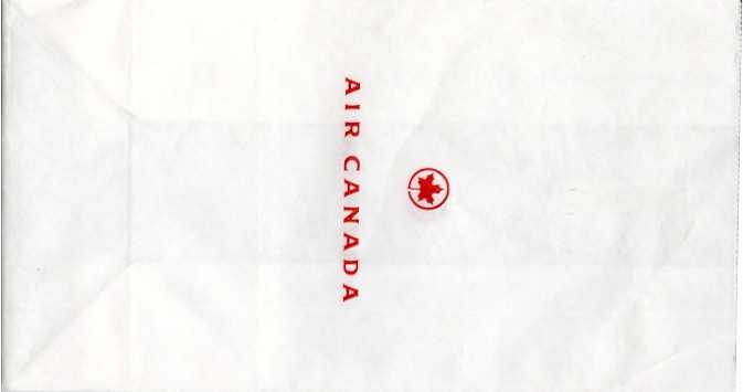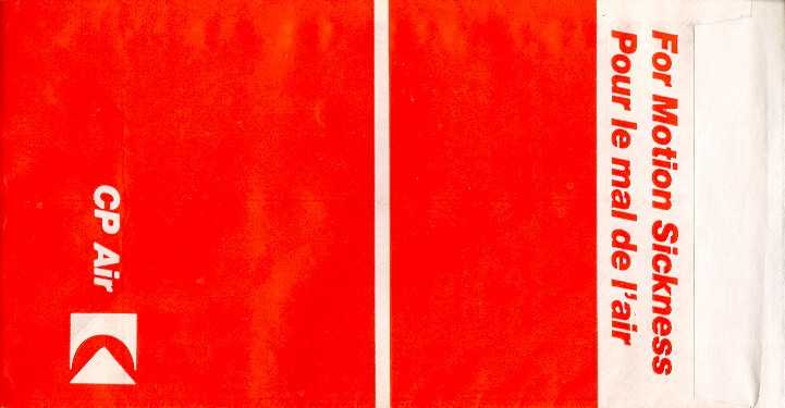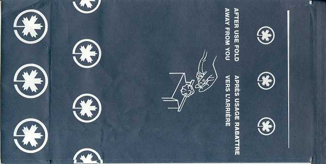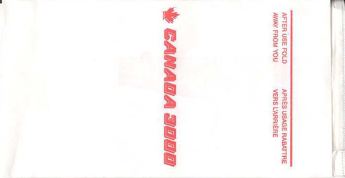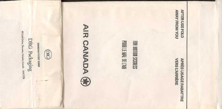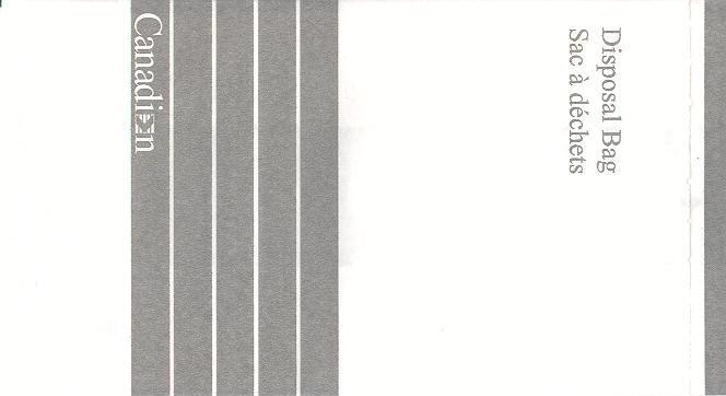 3000 2Slight different variant from Canada 3000. Instructions in English and French on top. Horizontal closing wire and Günter ACS logo in pleat.Thanks to Robert Florida. Only airline name and maple leaf in red print. Flat baes and horizontal closing wire. Günter ACS logo in pleat. Thanks to Josef Gebele. Canadian 1"For motion sickness - Pour le mal de l´air" on this Canadian bag. White with grey stripes manufactured by DRG. Thanks to Ken Pugh. Canadian 2"Disposal Bag/ Sac à déchets" on this Canadian bag. Folding instructions in two languages on back. Günter ACS logo in pleat. Thanks to Wolfgang Franken. CP Air