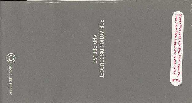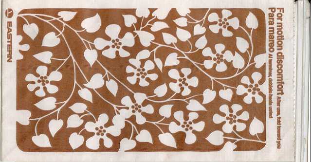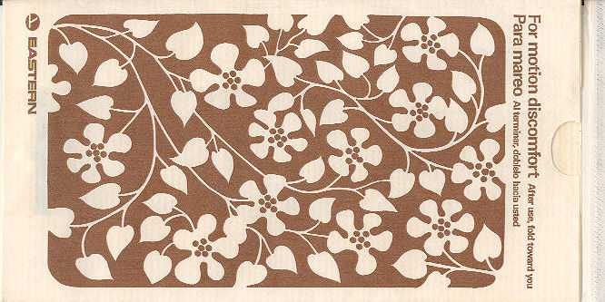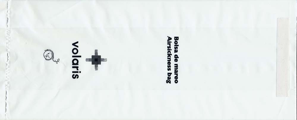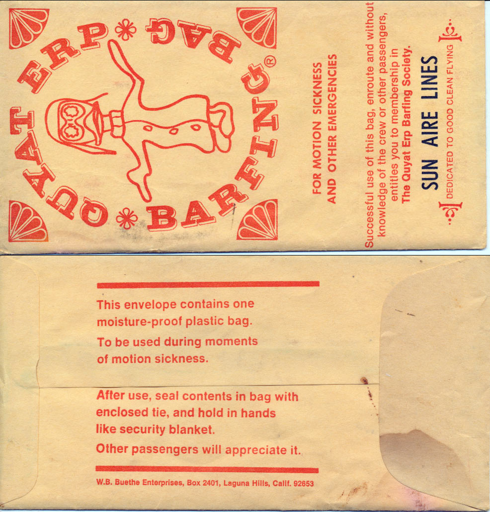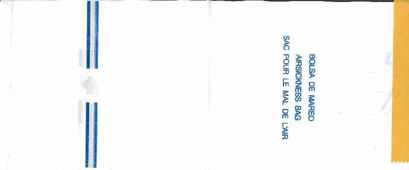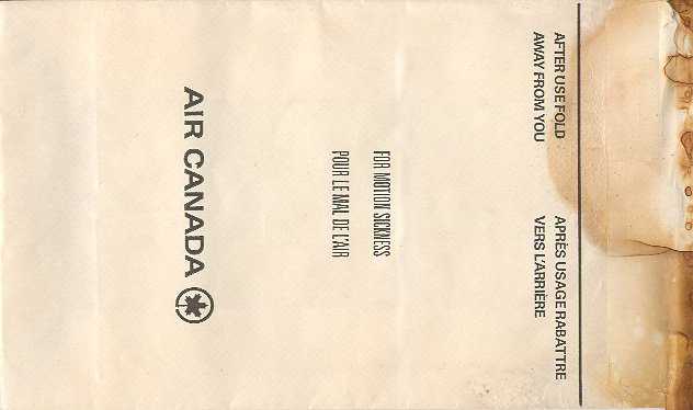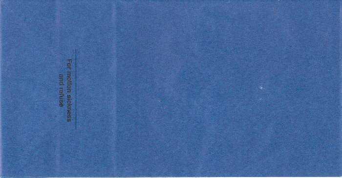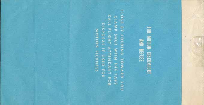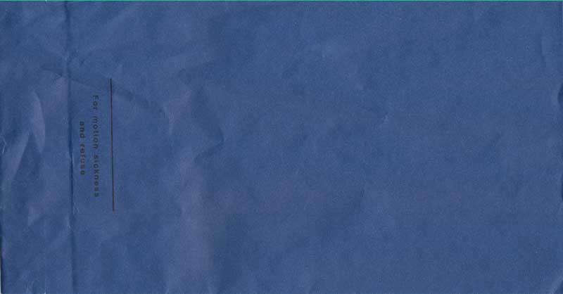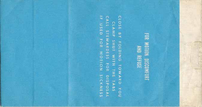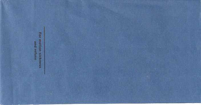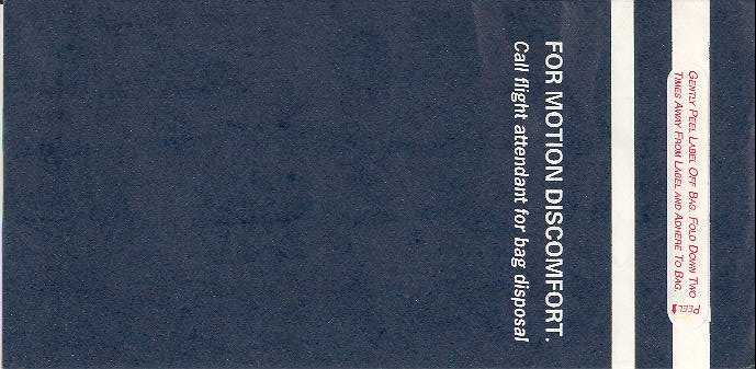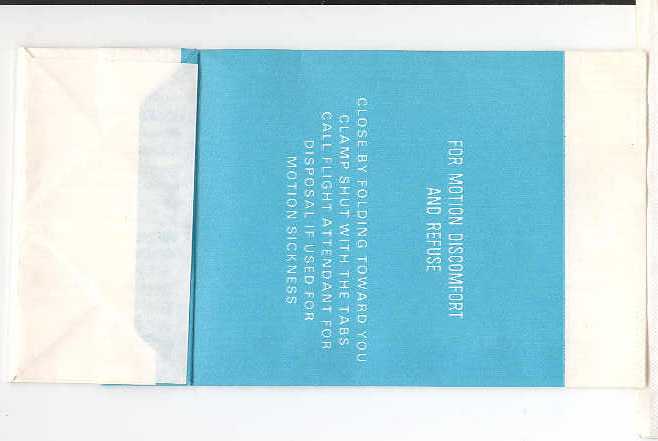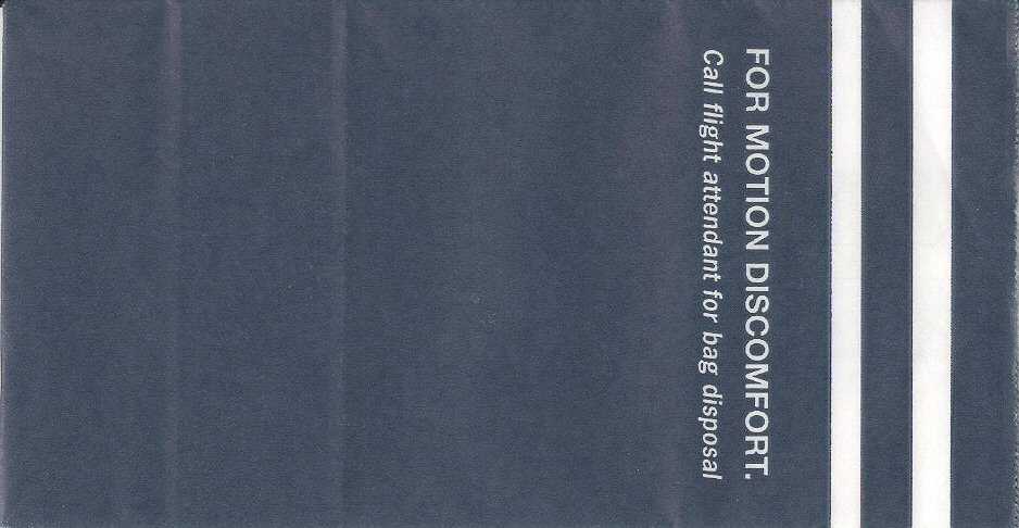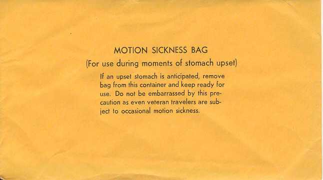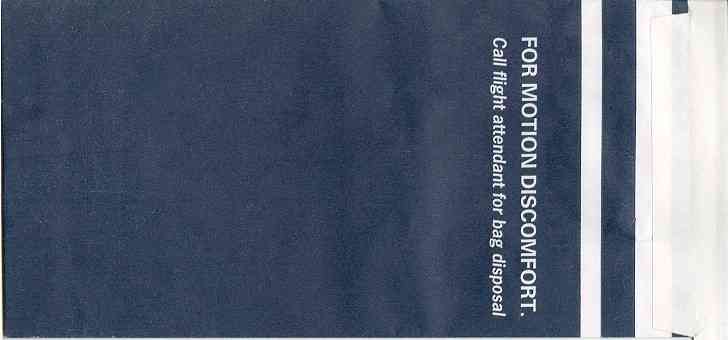 travelers are subject to occasional motion sickness". White plastic bag in a yellow envelope. This