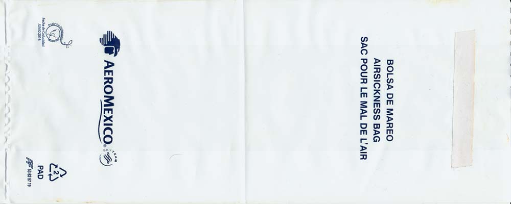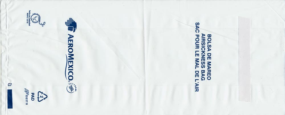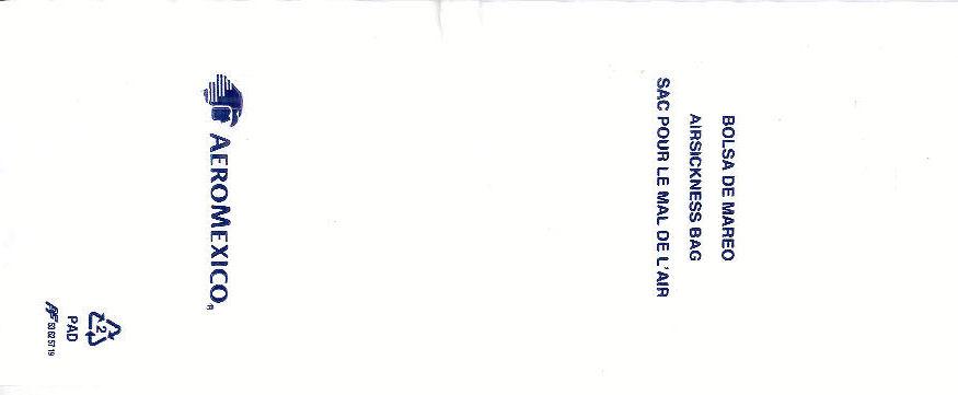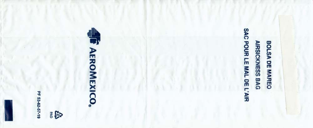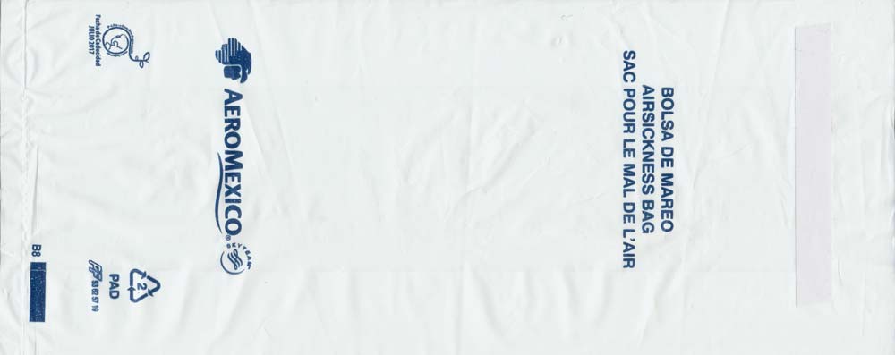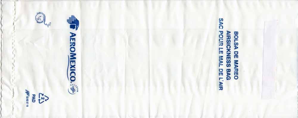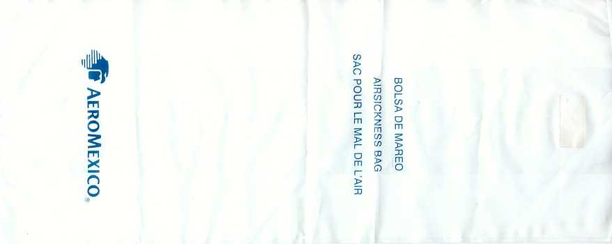Mexico: Aero Mexico 1Most south American airlines use half-transparent plastic bags, I can't understand why. Well, Aero Mexico's bag is long and narrow (for long flights?) with "airsickness bag" in three languages. Adhesive closing flap. Thanks to Per Olsson Artberger. Aero Mexico 2Aero Mexico has really exaggerated their logo on this plastic variant. Unusually for a plastic bag there is a horizontal closing wire. Thanks to Derek Delaney. Aero Mexico 3A similar bag to no 1, this one has only the logo not airline name. Adhesive closing flap. "Airsickness bag" in three languages. Thanks to Thorsten Hecht. Aero Mexico 4A similar bag to no 1, this one has the recycling logo and bagmaker on low right. Adhesive closing flap. "Airsickness bag" in three languages. Thanks to Massimo Nember Aero Mexico 5A similar bag to no 3, but this one has the adhesive flap for closing in a brown color. "Airsickness bag" in three languages. Thanks to Ronnie Irvine Aero Mexico
