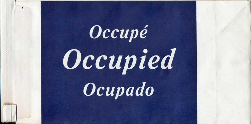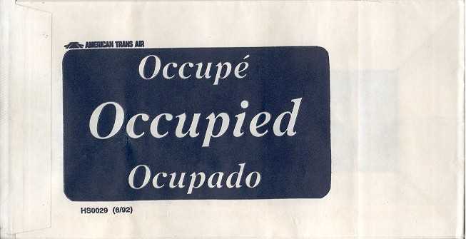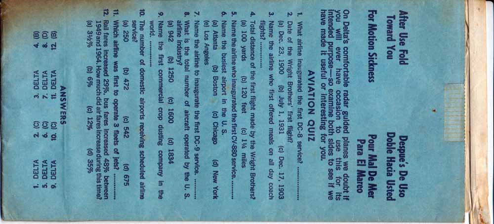 18Yet another Delta bag. Thick paper with flat base and horizontal closing wire. One color blue print. "Occupied" on front and "For motion discomfort" on back, both in 6 languages. Delta