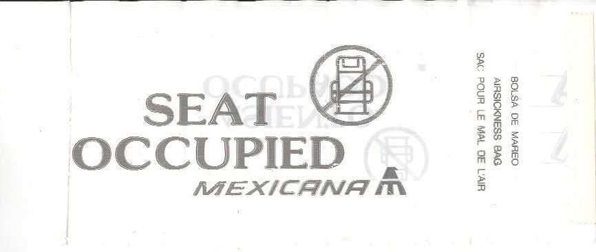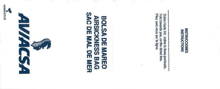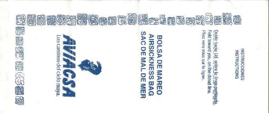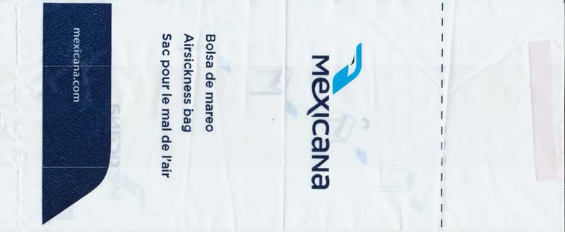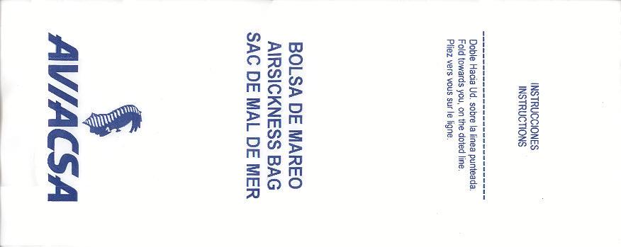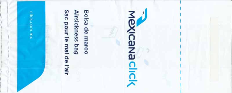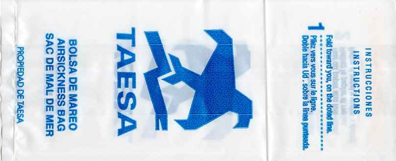 Mexico 10Yet another plastic variant with adhesive flap for closing. Thanks to Juan Carlos De Marco. Aviacsa 1The Mexican airline Aviacsa since 1990 with a very long bag (for looong flights?) Blue print on sturdy white plastic, not as flimsy as South American plastic bags use to be. Instructions in English, Spanish and French. Thanks to David Shomper. Aviacsa 2Long white plastic bag similar to #1 but with the decorative frame removed. Instructions in three languages. Bagmaker Agroplasticos logo on low left. Thanks to Matthias Koch. Aviacsa 3Long white plastic bag similar to #1 but with the decorative frame removed. Instructions in three languages. Bagmaker logo removed. Thanks to Matthias Koch. Mexicana 1I'm not sure why most of the South American airlines use plastic bags. Anyway, this specimen from Mexicana is a narrow long white model with adhesive closing flap and folding instructions on reverse side. Doubles as "Seat occupied" sign. Thanks to Al Halls Mexicana 2A paper variant from Mexicana, usually using plastic bags. This bag is very similar to Continental Airlines, only airline name differs. Very sturdy bag also doubles as seat occupied marker. Thanks to Bruce Kelly. Mexicana 3A plastic bag from Mexicana similar to #1 but this one with gray print instead of blue. graphic folding and closing instructions. Thanks to Robert Florida. Mexicana 4A brand new plastic Mexicana bag with the new airline logo. "Airsicknes bag" in three languages and dotted folding line. Instructions and adhesive tab for closing on back. Thanks to Erik Domajnko. MexicanaClickMexicanaClick, formerly Click Mexicana, was Mexicana's regional operator, serving most of Mexicana's domestic routes between more than 25 Mexican cities. It was founded as a low-cost carrier, but changed its market to regional operations after its acquisition by Mexicana. Plastic bag with adhesive closing tab. Thanks to Wolfgang Franken. Taesa