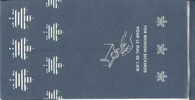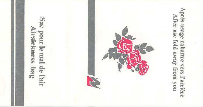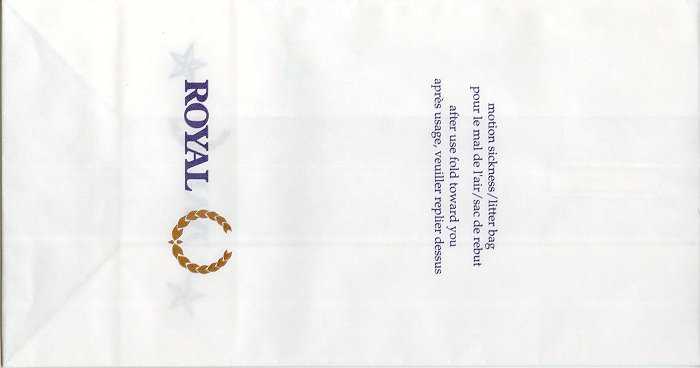 "For Motion Sickness - Pour le mal de l'air" on this extremely red bag from Canadian CP Air. High quality bag in sturdy paper with plastic inside and horizontal closing wire. Manufactured by DRG Packaging in Ontario, Canada. Thanks to Ken Pugh. NationairNationair-Canada. Started in 1986, ceased operations in 1994. A nice bag decorated with roses. A "After-use-fold-away-from-you"-bag. Instructions in English and French. Star in pleat. Thanks to Derek Delaney. Royal