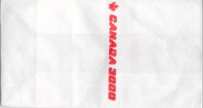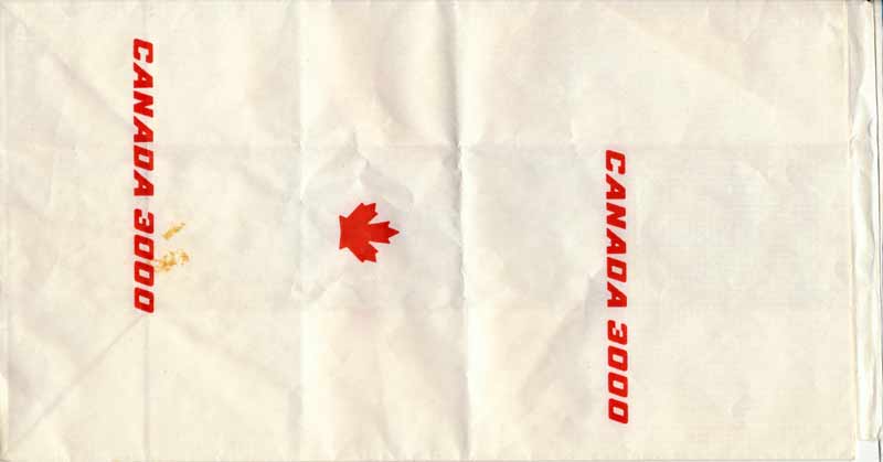 3000 1According to Canada 3000 home page, their slogan is "Reliable *affordable * air travel" On next line you can read: "Canada 3000 Airlines regrets to advise that it will cease flying operation effective November 9th, 2001. We are therefore unable to transport passengers to their destinations, and recommend that they seek alternative methods of travel. http://www.canada3000.ca/ Anyway, the bag is a rare collectors item from now on. Thanks to Aidan Stradling. Canada