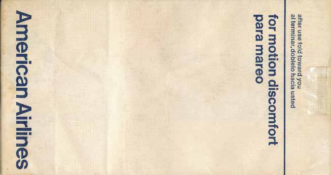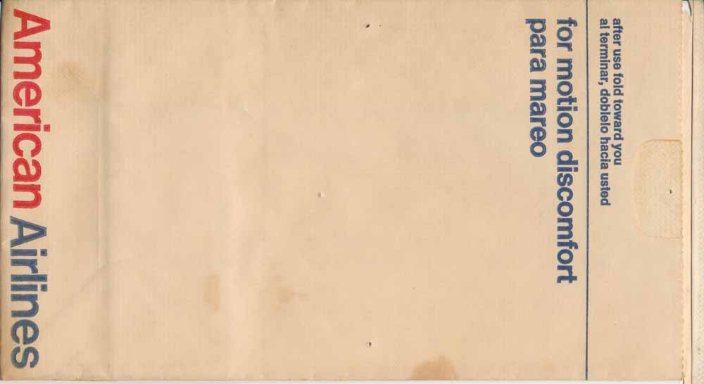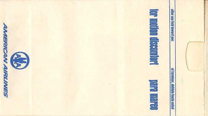 Air Florida was an American low-cost carrier that operated from 1971 to 1984. Flat base bag and "Please take me with you, I'm so useful." in pleat. Thanks to Richard Rosichan. Alaska Airlines 1Alaska Airlines, the closest they've come to an actual bag. This one actually has writing on it (not the name or logo, unfortunately). They've combined their seat occupied card with a barf bag, clever, eh? To my knowledge this bag is only used on Alaska Airlines so I'm not considering as a generic (yet). Thanks to Bruce Kelly. Alaska Airlines 2Alaska Airlines with another variant. This one has flat base and is a little shorter. Horizontal closing wire. Thanks to Bruce Kelly. Alaska Airlines 3This Alaska Airlines plastic bag has adhesive tab on back for closing. Flat base with no print. Thanks to Justin Dodge Alaska Airlines 4This Alaska Airlines plastic bag has adhesive tab on back for closing. Flat base with "U.S. Patent No. 7,041,042". Thanks to Justin Dodge American Airlines 1A vintage bag from the good old days before AA started using plain white bags. High quality bag with all refinements: Plastic coating inside, thumb grip for fast access, horizontal closing wire, flat base and instructions in English and Spanish. Thanks to Roger Macrae American Airlines 2Another vintage bag from the good old days before AA started using plain white bags. High quality bag doubling as photo bag with plastic coating inside, horizontal closing wire, flat base and instructions on back in English and Spanish. Thanks to Bruce Kelly. American Airlines 3Another vintage bag from the good old days before AA started using plain white bags. High quality bag with plastic coating inside, horizontal closing wire, flat base and folding instructions in English and Spanish. Thanks to Josef Gebele. American