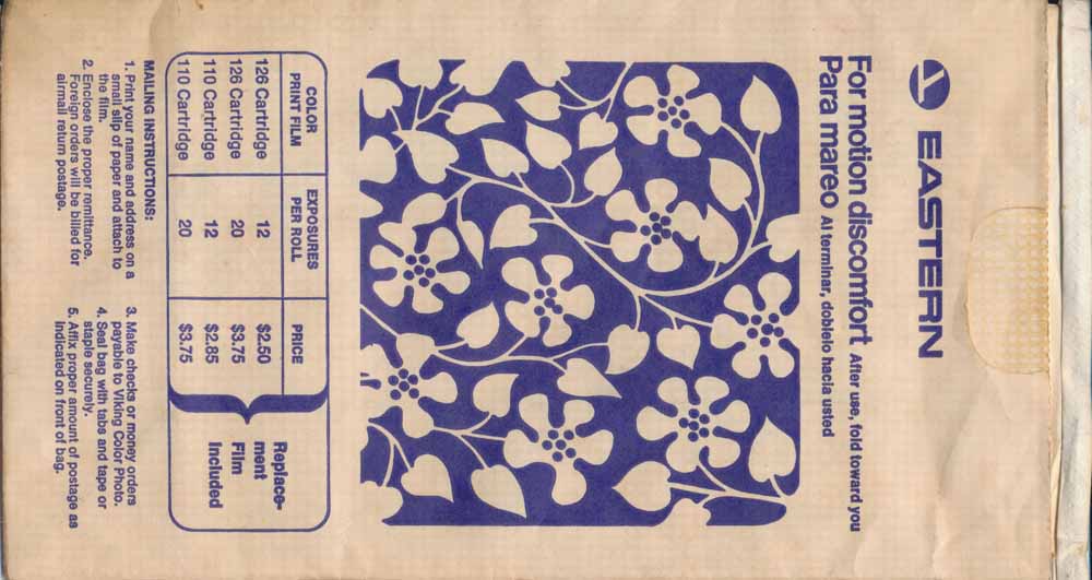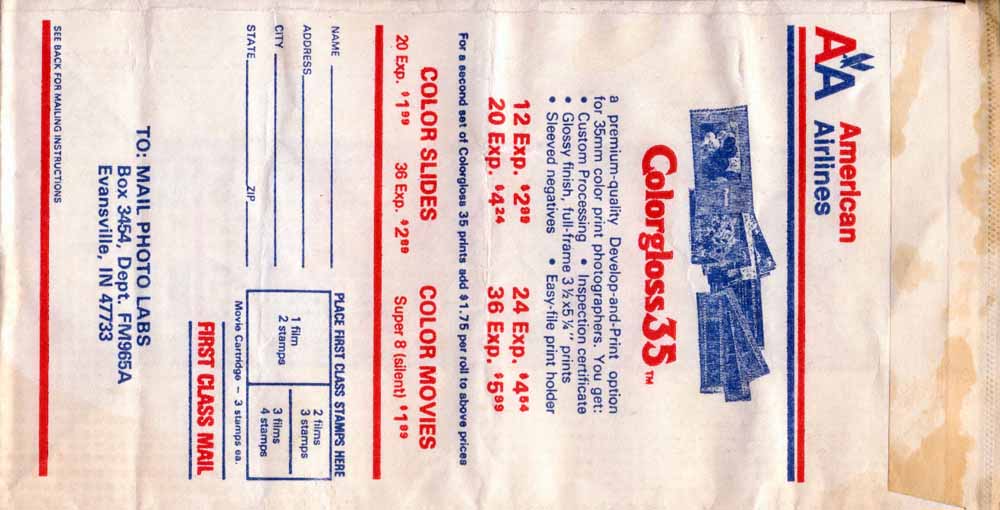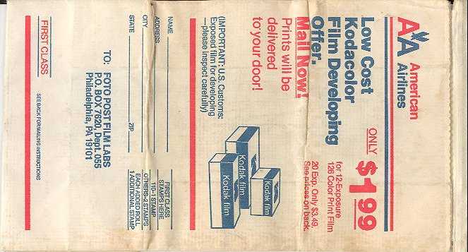 Another vintage bag from the good old days before AA started using plain white bags. High quality bag with plastic coating inside, horizontal closing wire and flat base. Doubles as photo bag. Thanks to Ken Schafermeyer. American