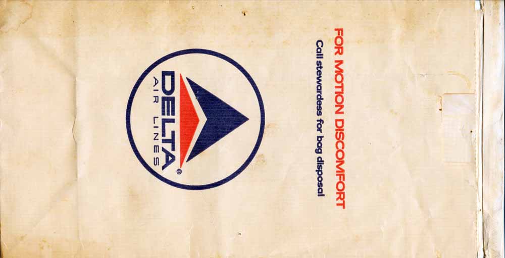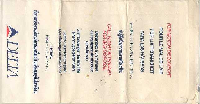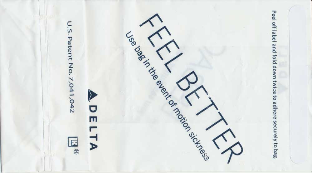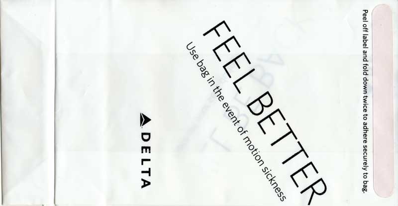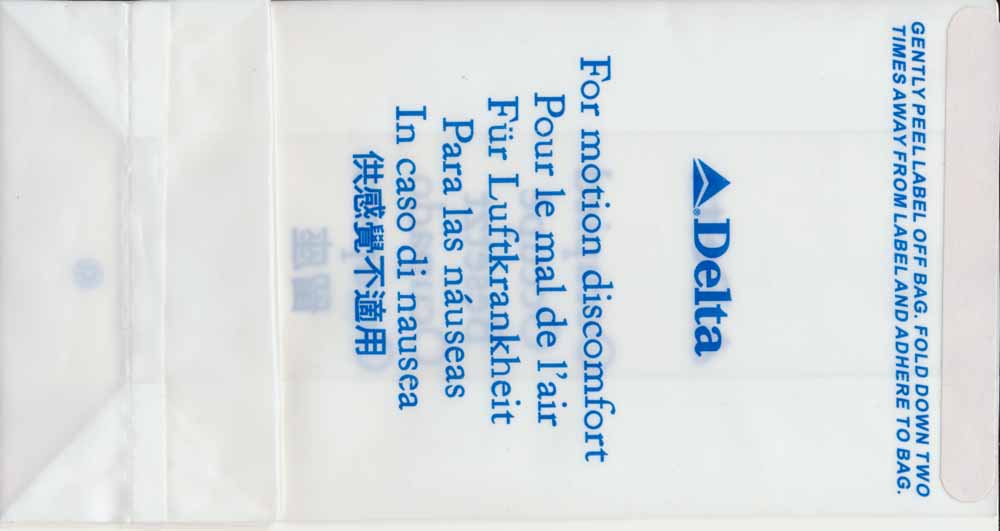Lines 5Firm bag as usual from Delta, similar to my Delta Air Lines 1 but horizontal closing wire instead of the peel off label. Doubles as seat occupied marker in eight languages. Thanks to Fabian Schuetz This variant from Delta has "For motion discomfort" and "Call flight attendant for bag disposal" in 6 languages on both side of bag. Delta logo low on bag. Thanks to Bruce Kelly. Delta Air Lines 7Delta airlines has sure used a large variation of bags over the years. This variant has "For motion discomfort" and "Call flight attendant for bag disposal" in five different languages. Folding instructions on back and horizontal closing wire. Thanks to Bruce Kelly. Delta Air Lines 8Yet another Delta bag. This one is made of a thick plastic material, not as flimsy as the South American bags. One color blue print. "Occupied" on front and "For motion discomfort" on back, both in 6 languages. Peel off label on back for closing. Thanks to David Shomper. Delta Air Lines 9This Delta bag is very similar to #3 but this has different text, the word "Bitte" is added in the German text. Thanks to Robert Florida. Delta Air Lines 10Delta Airlines with a brand new bag, this time a plastic one. "FEEL BETTER" on one side and "I'LL BE BACK" on other side. Peel off label on top for closing. "U.S. Patent No. 7,041,042" on base. Thanks to Frank Mulliri. Delta Air Lines 11Delta Airlines with a brand new bag, this time a plastic one. "FEEL BETTER" on one side and "I'LL BE BACK" on other side. Peel off label on top for closing. "U.S. Patent No. 7,041,042" and bagmaker LK Plastics logo on base. Thanks to Frank Mulliri. Delta Air Lines 12Delta Airlines with a brand new bag, this time a plastic one. "FEEL BETTER" on one side and "I'LL BE BACK" on other side. Peel off label on top for closing. "U.S. Patent No. 7,041,042" and bagmaker LK Plastics logo on base (different from #11). Thanks to Josef Gebele.