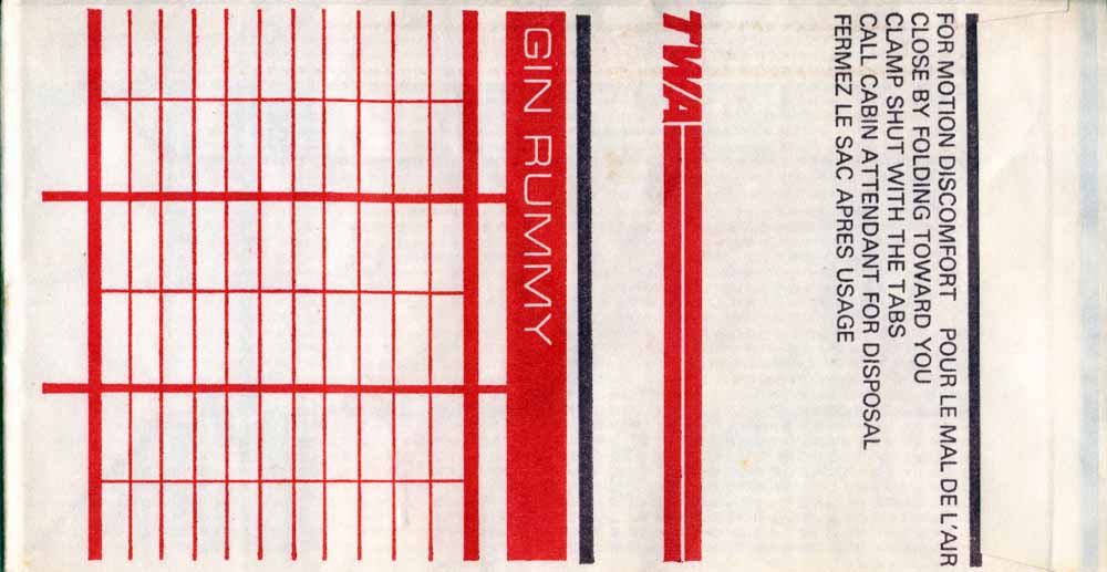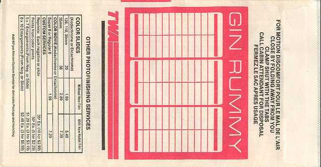Airlines (TWA) 2This is a unique bag bag in the sense that it has tipple use. I seen a lot of bags with double use, for example seat occupied marker. This bag has a gin rummy score board and is a photo bag as well. Horizontal closing wire and mailing instructions for the photo bag in pleat. Thanks to Bruce Kelly Trans World