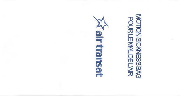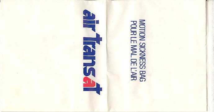 Canada: Air Canada 1National carrier Air Canada with a "After use fold away from you"-bag which tend to be more unusual than the "After use fold towards you"-type. This dark blue bag with white logo and instructions in English and French have all refinements: flat bottom, horizontal closing wire, firm paper with plastic coating inside, made by Winpack. High quality bag. Thanks to Brent Antonson. Air Canada 2Air Canada with a more simple bag. Red print on white bag. Flat bottom, vertical closing wire, no instructions, made by Günter ACS. Thanks to Brent Antonson. Air Canada 3Air Canada with a Winpack bag, there is also an generic version without the airline name. Thanks to Ken Pugh Air Canada 4No, this bag is not used, just looks like that because it has a bit of discoloring. DRG manufacturer, horizontal closing wire, English and French instructions. Thanks to Bruce Kelly. Air Canada 5Red print on white bag. Similar as Air Canada 2 but this one with De Ster logo and number "PS 2051" on base. Thanks to Bruce Kelly. Air Canada 6Nice bag from Air Canada with the stripy logo. Plastic coating inside, horizontal closing wire, made by Winpak. Thanks to Derek Delaney. Air Canada 7This bag is similar to bag #3 but this one has "DRG Packing" on base. Thanks to Robert Florida. Air Canada 8This Air Canada bag has instructions on base "Please ask your flight attendant for the proper disposal of a used needle" and "PS 2051". Thanks to Josef Gebele. Air Transat 1Canadian charter carrier. White bag with vertical closing wire. Günter logo in pleat. Thanks to Ken Pugh Air Transat 2Canadian charter carrier. White bag with horizontal closing wire. No bagmaker logo in pleat. Thanks to Derek Delaney. Air Transat 3Canadian charter carrier. White bag with vertical closing wire. Star on flat base. Thanks to Thorsten Hecht. Air Transat 4Canadian charter carrier. White bag with vertical closing wire. New logo. Star on flat base. Thanks to Thorsten Hecht. Canada