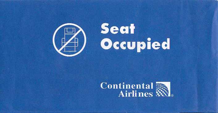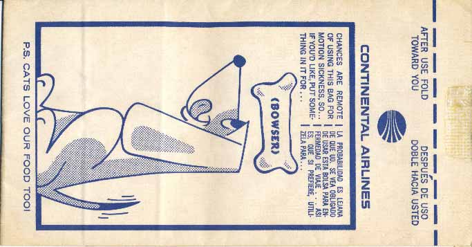 2Another more simple variant from Continental. This version is slight bigger and missing the white part with the closing wings. Star in pleat. Thanks to Mark Brace. Continental 3This bag from Continental shouts "SEAT OCCUPIED" with big letters. Don't dare to sit there for heavens sake! Only small airline name and logo. Thanks to Ken Pugh. Continental 4Another variant of the "Seat Occupied" bag, this time with the complete name "Continental Airlines". An octagonal star in pleat, a bagmaker logo I never seen before, anyone know who it is? Vertical closing wire and dotted folding lines on back. Thanks to Frank Mulliri. Continental 5A classic vintage bag from the good old days before Continental went to plain white bags. Usually Continental has double use as "Seat occupied"-marker but this is double use as doggie bag. "P.S. Cats love our food too!" (I doubt it...). Thanks to Josef Gebele. Continental