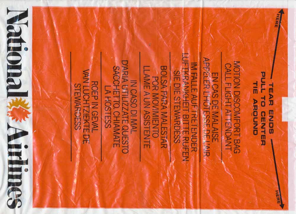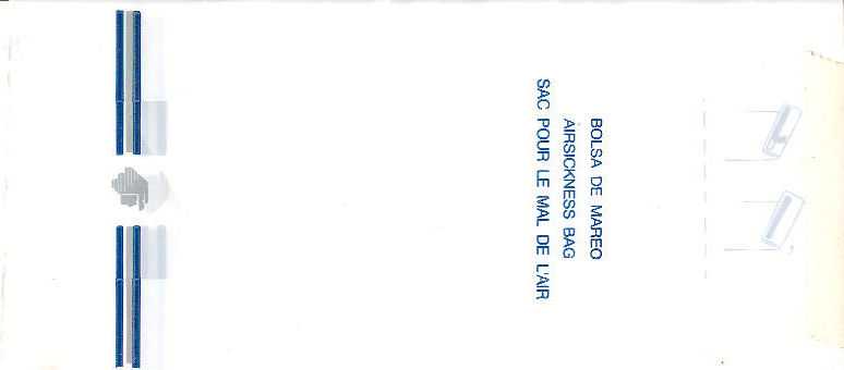 1A huge plastic bag from National Airlines. This is the biggest bag in the collection measuring 250 x 380 mm. I had to scan it in two sections and "glue" together! Interesting closing mechanism "Tear ends pull to center tie around". I'm not sure if big barf bags are a good sign for the airline or not. Thanks to Roger Macrae. National Airlines
