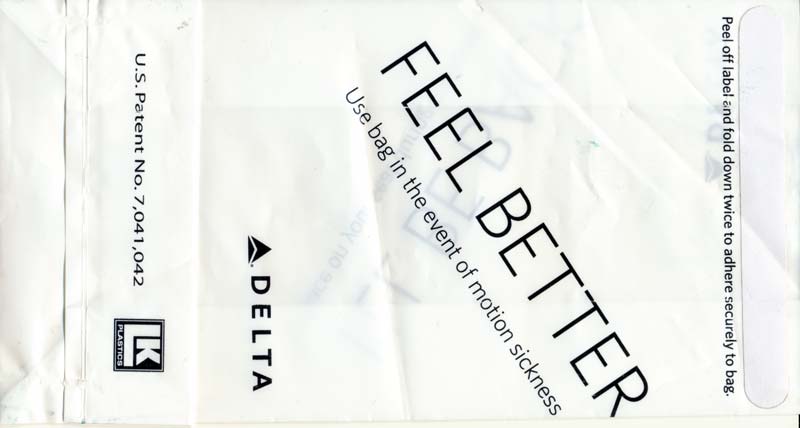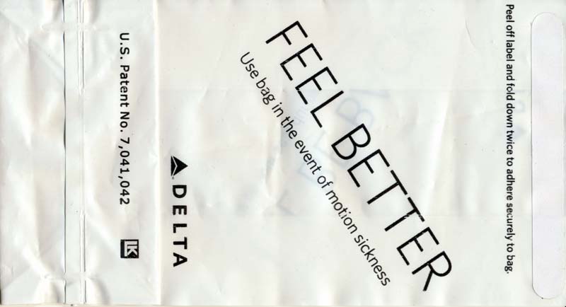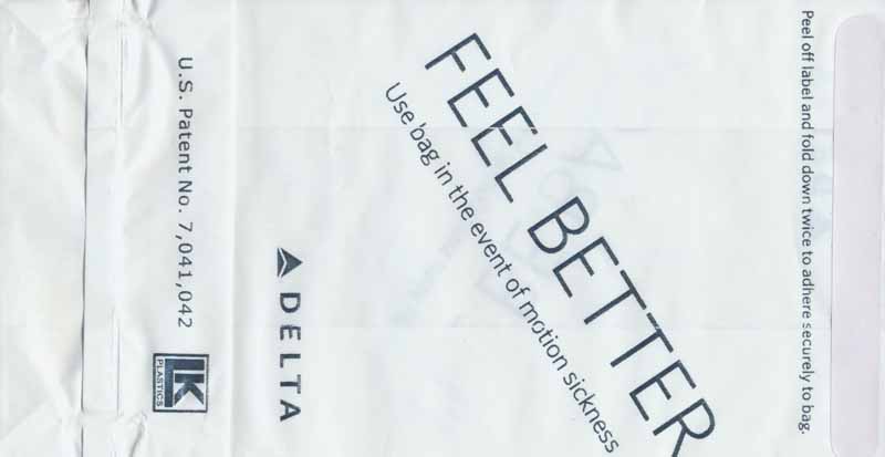 USA: Delta Air Lines 13Delta Airlines with a brand new bag, this time a plastic one. "FEEL BETTER" on one side and "I'LL BE BACK" on other side. Peel off label on top for closing. "U.S. Patent No. 7,041,042" and bagmaker LK Plastics logo on base (bigger size). Thanks to Josef Gebele. Delta Air Lines 14Yet another Delta bag. This one is made of a thick plastic material, not as flimsy as the South American bags. One color blue print. "Occupied" on front and "For motion discomfort" on back, both in 6 languages. Peel off label on back for closing. Similar to #8 but this has a small logo low on bag (bagmaker?). Thanks to Vladimir Hlasny. Delta Air Lines 15Yet another Delta "Feel better"-bag. This one has the bagmaker LK small logo with a big ® symbol on base. Thanks to Josef Gebele. Delta Air Lines 16Yet another Delta "Feel better"-bag. This one has the bagmaker LK small logo with a small ® symbol on base. Thanks to Josef Gebele. Delta Air Lines