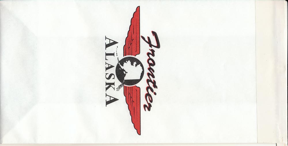 plastic bag. Thanks to Wolfgang H. Lüthje Alaska 40-mile Air Ltd. is a small bush airline that used these bags over 15 years ago. They were used as a combination barf/trash bag according to the owner. "First In Service, But Safety First". One of the biggest bags in the collection 356 x 275 mm. Thanks to Bruce Kelly. Air