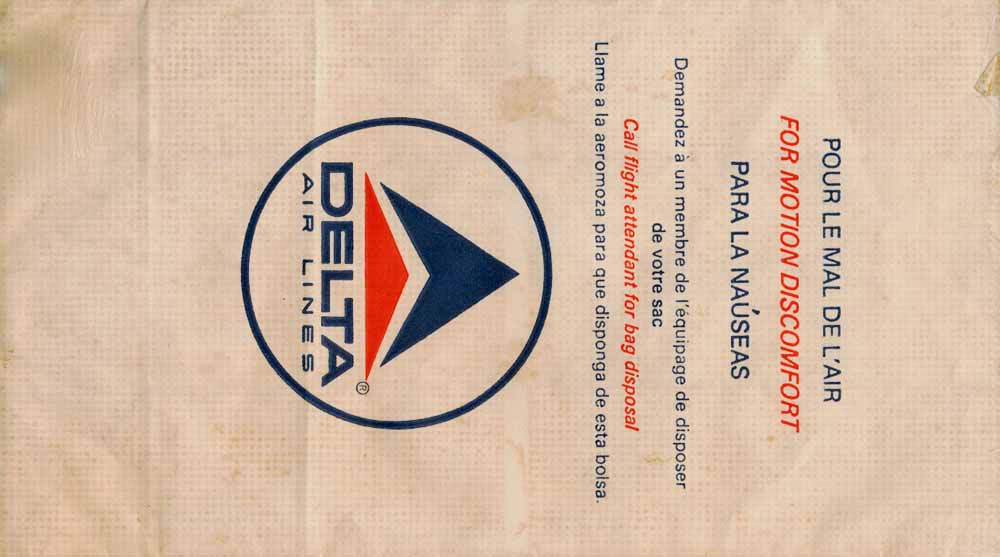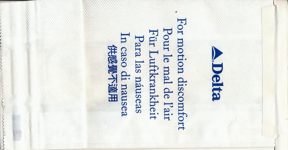 Lines 2 Other (older?) gray design from Delta. High quality bag with plastic inside and horizontal closing wire. "For motion discomfort" in 6 languages. Thanks to Stuart Hickson Delta Air