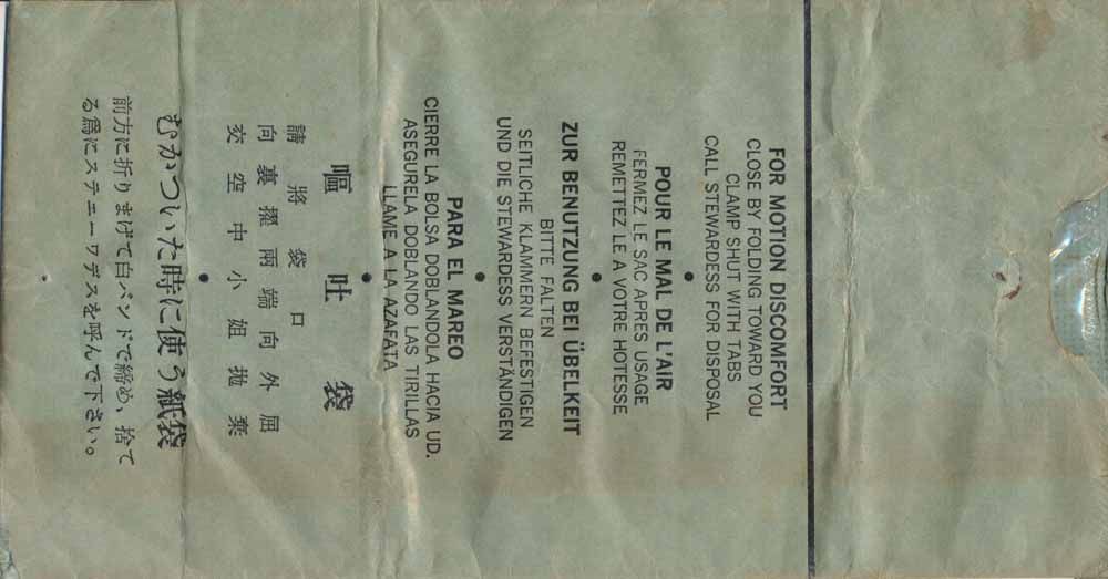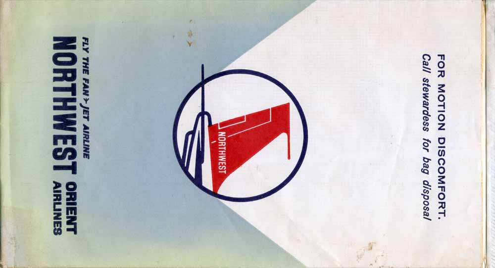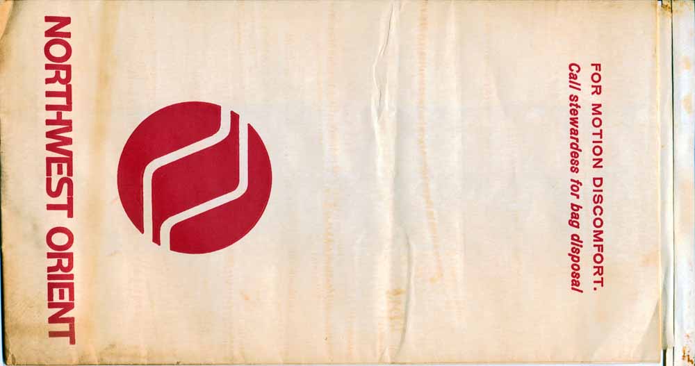 Orient 1Northwest Orient (now Northwest Airlines) with a sturdy bag with thick plastic coating inside. Horizontal closing wire. Thanks to Ken Pugh. Northwest