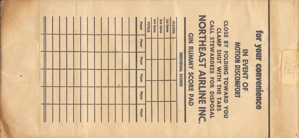 Northeast Airlines was a major U.S. air carrier based in Boston, Massachusetts. The airline was acquired by and merged into Delta Air Lines in August 1972. A "Gin rummy score pad-bag" with flat base and horrizontal closing wire. Bagmaker Arkell and Smith on base. Thanks to Richard Rosichan. Northwest