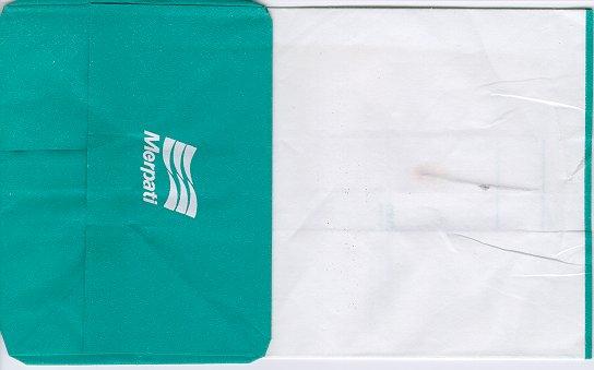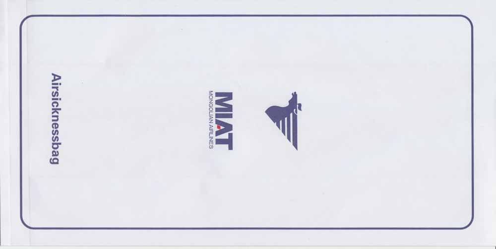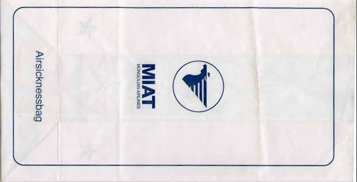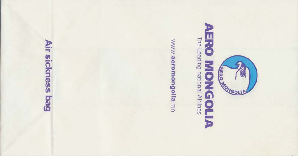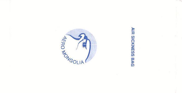 Mongolia 1"Aero Mongolia is a new consumer airline that has been developed to take advantage of a shortage in the domestic travel providers in Mongolia." from air Mongolia's web. A tear off top bag with pointy bottom and two vertical closing wires on back. Thanks to Alan Howlett. Aero