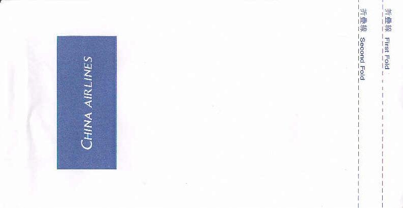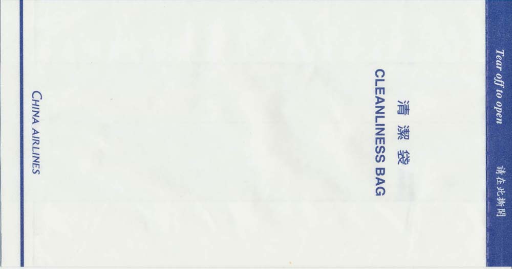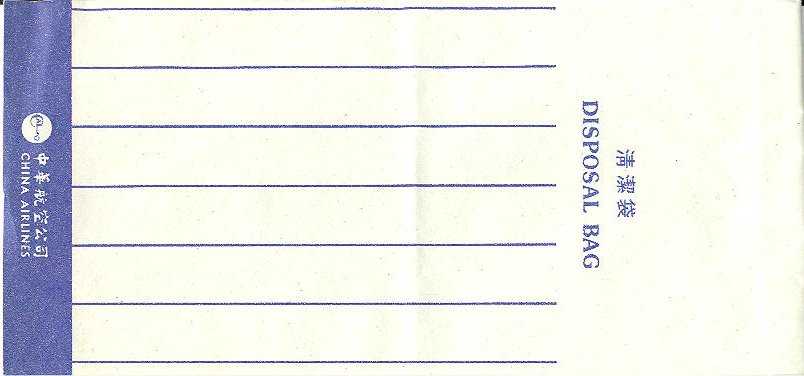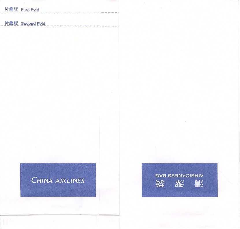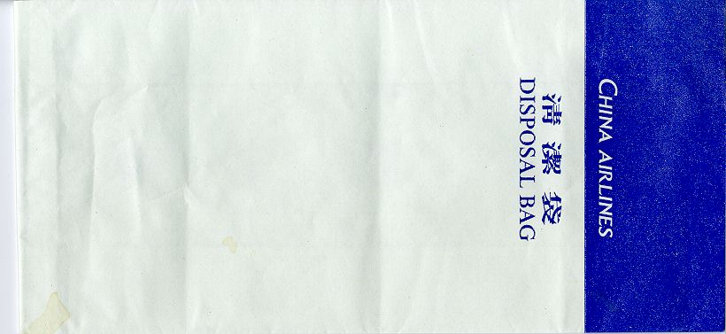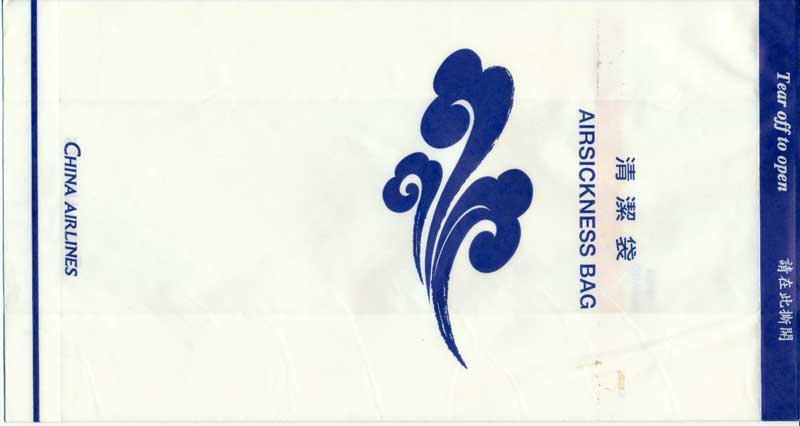 6A "Tear-off-to-open"-bag from this Taiwanese airline. Pointy base and vertical closing wire. Thanks to Nico Snels. China Airlines 7A "Tear-off-to-open"-bag from this Taiwanese airline. Pointy base and a "peel off paper" closing mechanism. Thanks to Josef Gebele. China Airlines