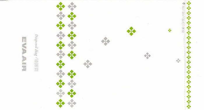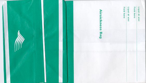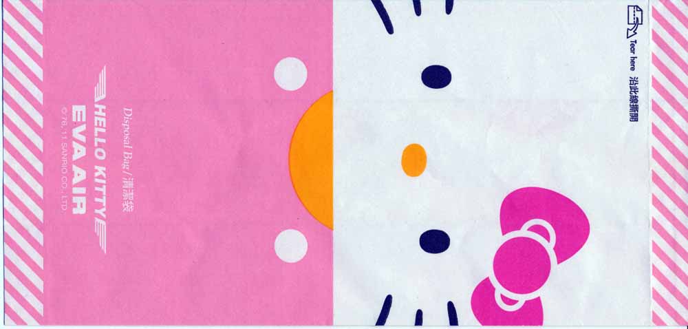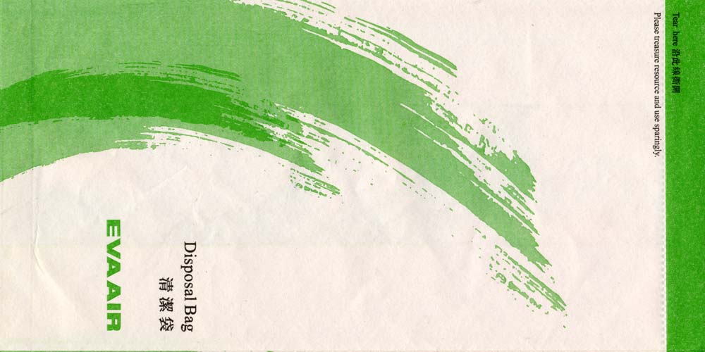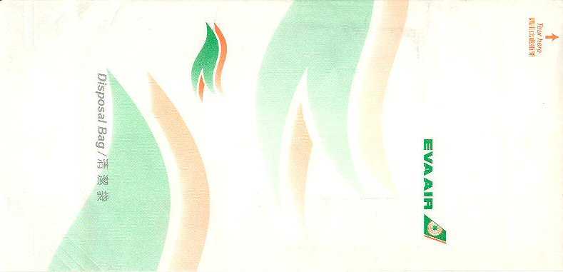 3Taiwanese Eva Air with a new variation on this edition. Green logo and small gray stripes all over the bag. No instructions or closing mechanism. Thanks to Wilson Lui. |
