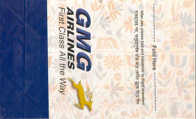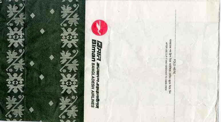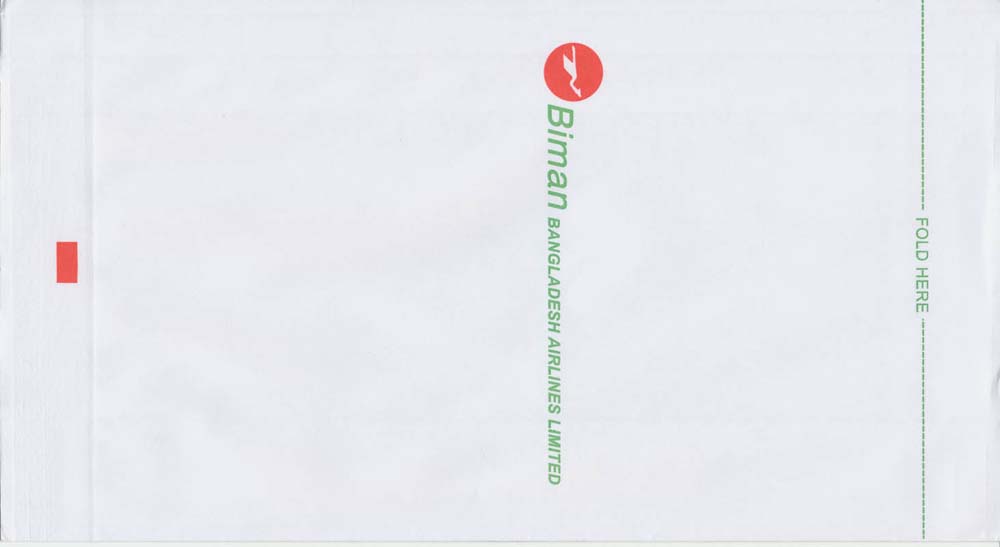 AirlinesBhutan Airlines, is Bhutan's first private airline. The airline resumed services on 10 October 2013, beginning its first international flights to India and Thailand. Nice fish logo on this tear-off-top-bag by mistake print as "fold here". Thanks to Wolfgang H. Lüthje. Biman 1Creative design from Biman Bangladesh Airlines. Red and green print on white bag. Folding instructions with dotted line to ensure the correct folding. Instructions in English and Bengali- the official language of Bangladesh (and the Bengal state of India). "After use clip it and handover to cabin crew". Vertical wire closing. Thanks to Bruce Kelly. Biman 2Another Biman, Bangladesh Airlines, bag similar to number 1. This one is printed on brown paper and has "Manufactured by Modern Enterprise" printed on back. Vertical wire for closing. Instructions in English and Bengali. Thanks to Christian Annyas. Biman