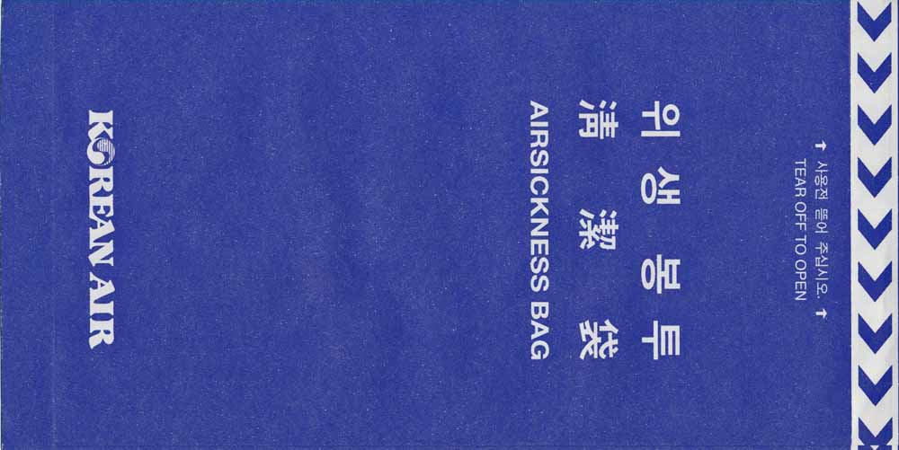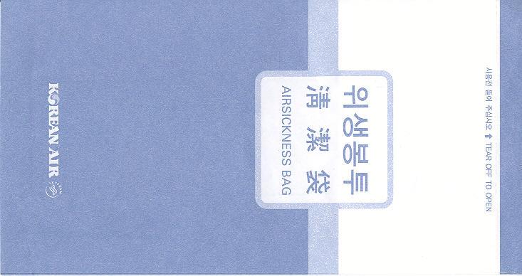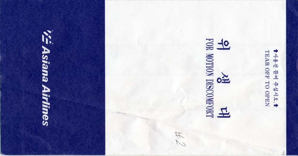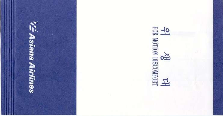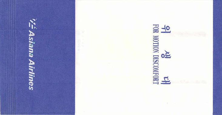 Wings AirwaysAsian Wings Airways is an airline based in Myanmar. It began service on 27 January 2011. Tear off top and instructions on back. Thanks to Wolfgang H. Lüthje. Asiana Airlines 1 A South Korea based airline. White and blue bag with double vertical closing wires. "For Motion Discomfort" in English and "For Hygiene" in Korean on front. Other unknown (for me) Korean text on back. Thanks to Bruce Kelly. Asiana Airlines 2A South Korea based airline. This bag is similar to no 1 but have slight different typeface on the Korean "Hangul" characters and a brighter blue color. Thanks to Karl English. Asiana Airlines