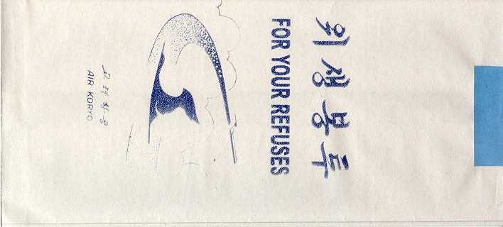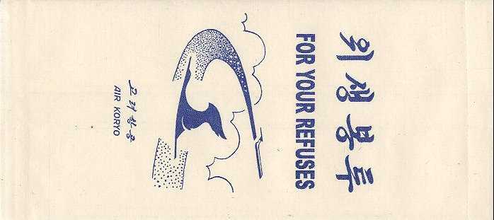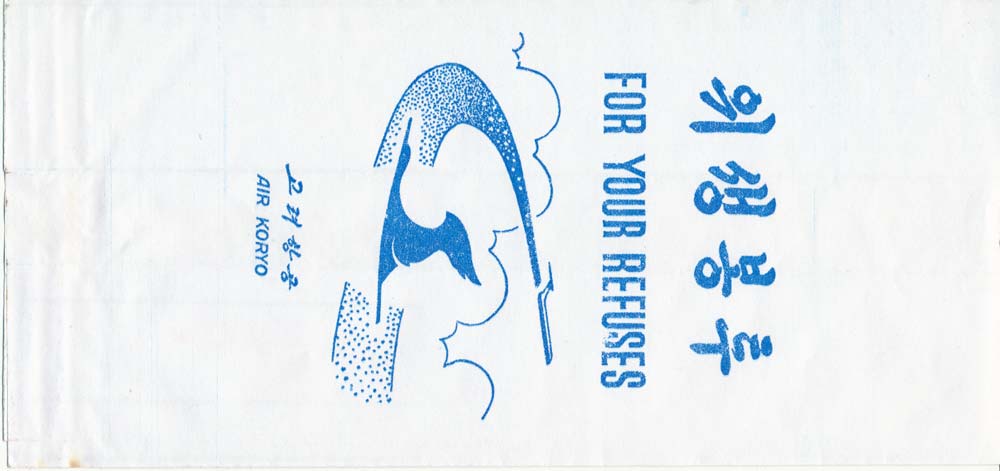 KBZ 2Air KBZ is a privately owned domestic Burmese (Myanmar)airline based in Yangon. Nice bag with instructions on back, vertical closing wire and different contact information on base. Thanks to Frank Mulliri. Air Koryo 1Air Koryo, until recently known simply as Korean State Airlines or CAAK, was set up in 1954 to succeed a Soviet-North Korean carrier formed in 1950 during the three-year war on the Korean peninsula, divided at the end of World War Two. It currently operates a fleet of 25 Soviet-built Antonov, Ilyushin and Tupolev passenger and cargo aircraft out of a main base at Pyongyang's Sunnan Airport. Thanks to Peter Kunst. Air Koryo