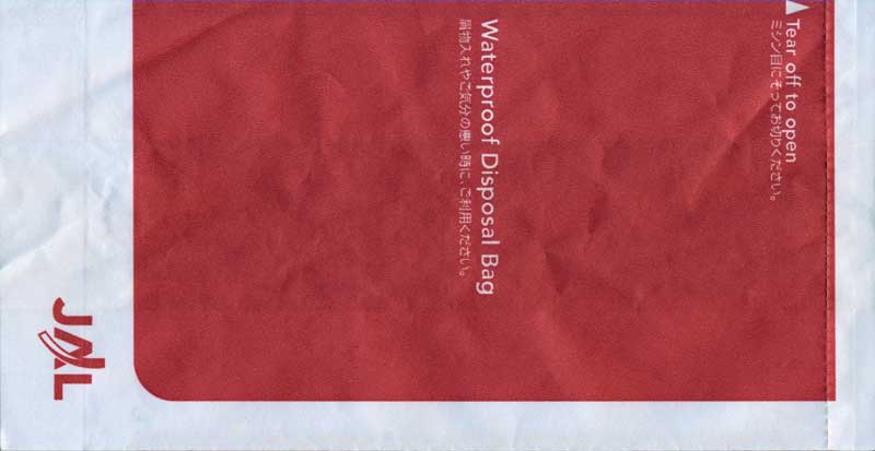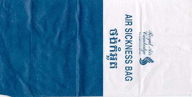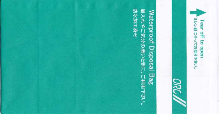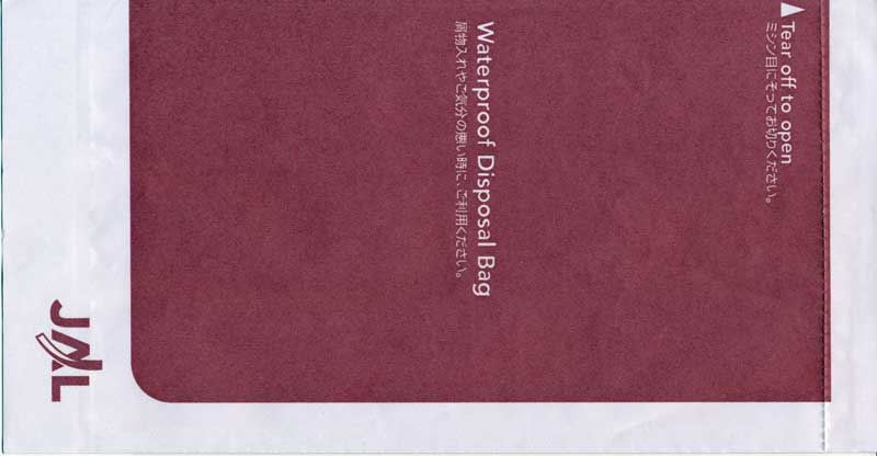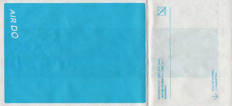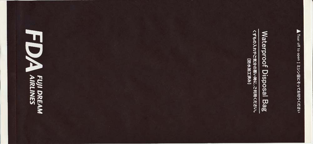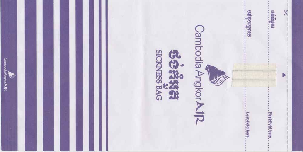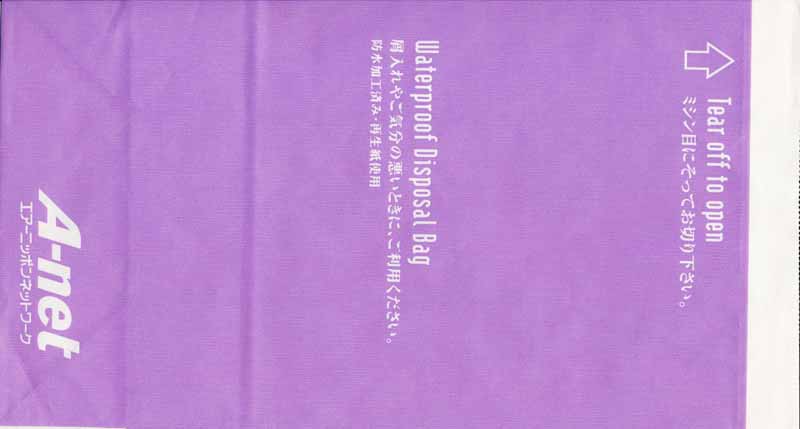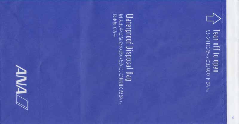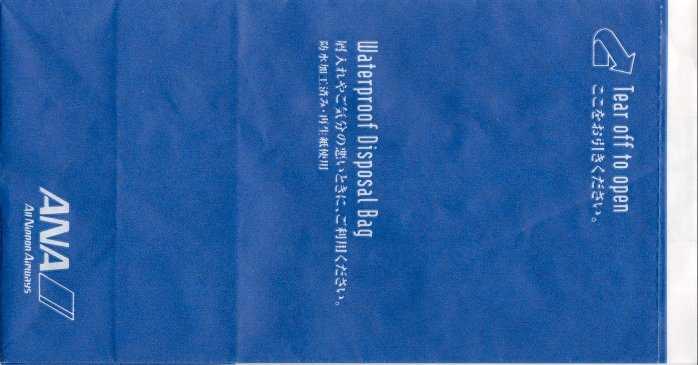 5Yet another "Waterproof Disposal Bag" from Japanese All Nippon Airwais (ANA). "Tear-off-to-open"-top and instructions in Japanese and English. Thanks to Leon Jang. Angkor AirwaysCambodian Angkor Airways with a "Tear-off-to-open"-bag. Pointy bottom, folding line on both sides and horizontal peel off sealing string. Thanks to Donald MacFie. Ariana