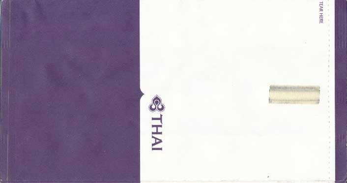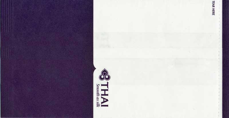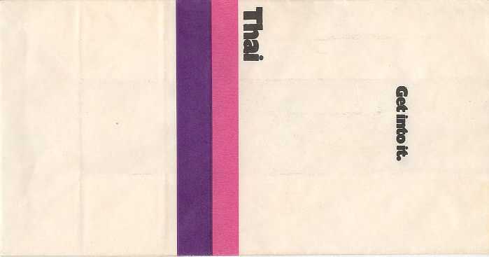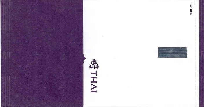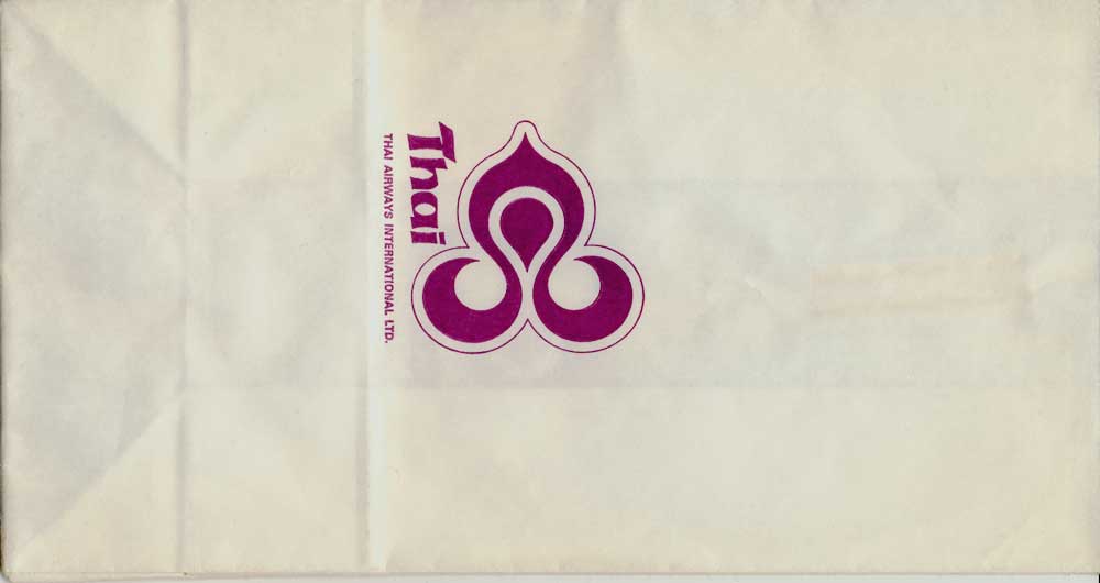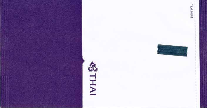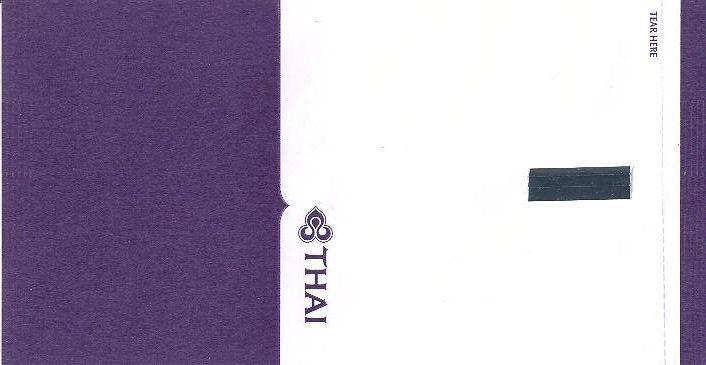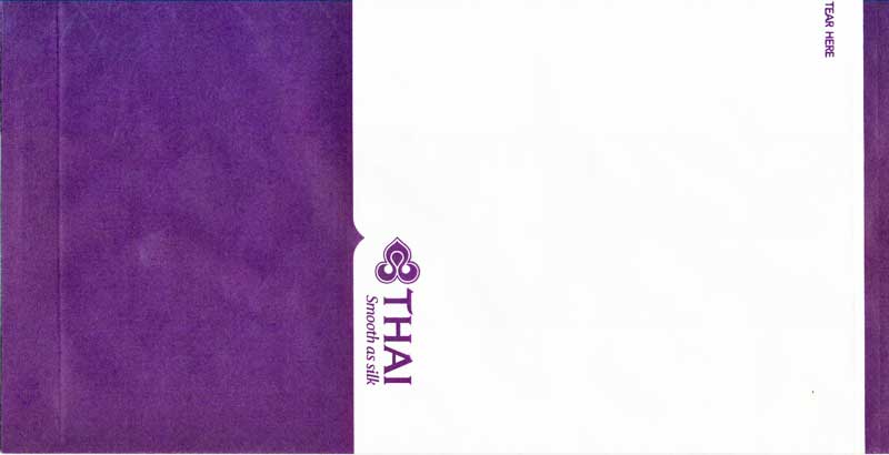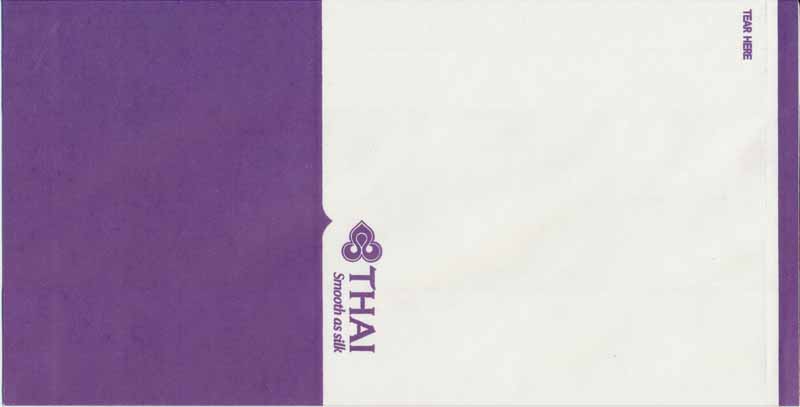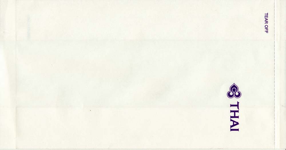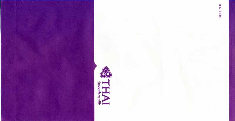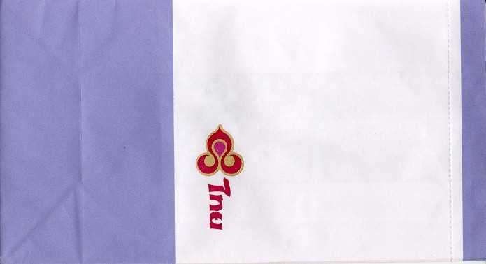 Christian Annyas. Vintage Thai bag from 1973. The slogan "Get into it" is a bit amusing on a barf bag. What where they thinking? Old ELAG logo on base. Thanks to Richard Hines. Thai 7Vintage Thai bag. "ELAG CH-3422 Kirchberg" on base of bag. Vertical closing wire on back. Thanks to Robert Florida. Thai 8Brand new Thai bag with new logo, tear-off-top and vertical closing wire in silver! "Vorapan Packing CO., Ltd. Made in Thailand, July 2006" in pleat. Thanks to Karl-Erik Wallin. Thai 9Brand new Thai bag with new logo, tear-off-top and vertical closing wire in silver! "Vorapan Packing CO., Ltd. Made in Thailand, Oct 2006" in pleat. Thanks to Donald MacFie. Thai 10Brand new Thai bag with new logo, tear-off-top and vertical closing wire in silver! "Vorapan Packing CO., Ltd. Made in Thailand, Jun 2006" in pleat. Thanks to Josef Gebele. Thai 11Brand new Thai bag with new logo, tear-off-top and vertical closing wire. "Y.N.S. MARKETING. Made in Thailand, March 2007" in pleat. Thanks to Josef Gebele. Thai 12Brand new Thai bag with new logo, tear-off-top and vertical closing wire. "Y.N.S. MARKETING. Made in Thailand, April 2008" in pleat. Thanks to Frank Mulliri. Thai 13Brand new Thai bag with new logo, tear-off-top and vertical closing wire. "Y.N.S. MARKETING. Made in Thailand, July 2009" in pleat. Thanks to Josef Gebele. Thai 14Brand new Thai bag with new logo, tear-off-top and vertical closing wire. "Y.N.S. MARKETING. Made in Thailand, December 2009" in pleat. Thanks to Josef Gebele. Thai 15Brand new Thai bag with new logo, tear-off-top and vertical closing wire. "Y.N.S. MARKETING. Made in Thailand, July 2010" in pleat. Thanks to Wolfgang Luthje. Thai 16A vintage Thai bag with only airline logo on white bag with flat base. Thanks to Juan C De Marco. Thai 17A minimalistic Thai bag with only small airline logo on white bag with pointy base. Thanks to Frank Mulliri. Thai