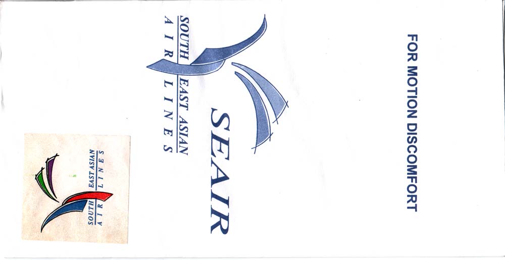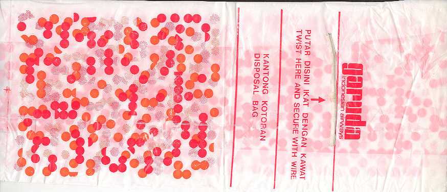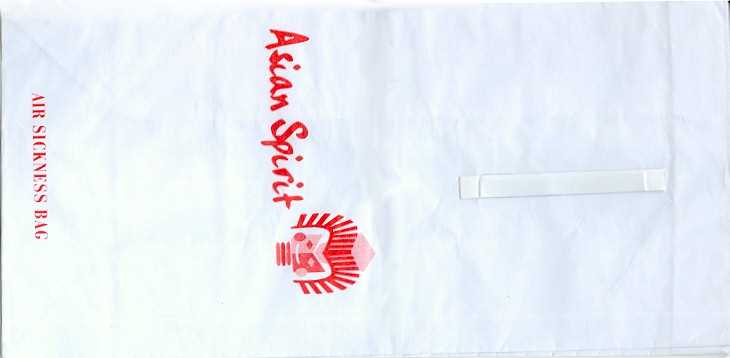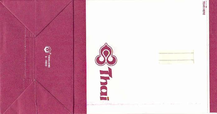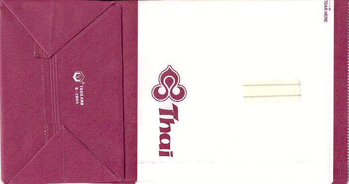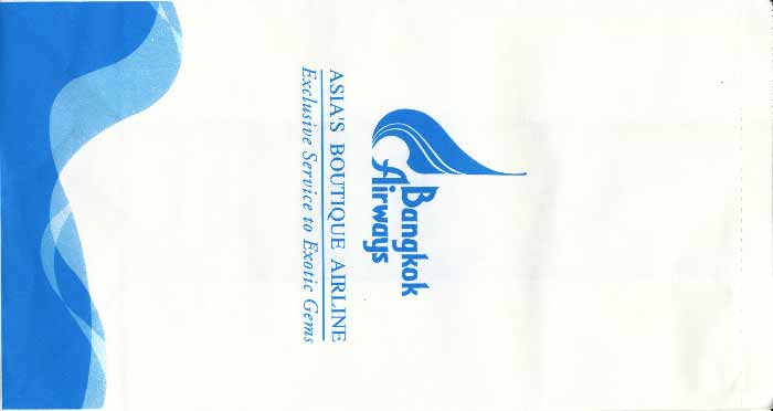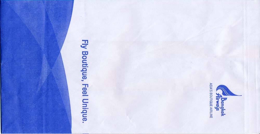 3A very normal paper bag with tear-off-top, flat base and vertical closing wire from Bangkok Airways. Thanks to Frederik Witte. Bangkok Airways 4A very normal paper bag with tear-off-top, flat base and vertical closing wire from Bangkok Airways. Saw-toothed cutting and different closing wire. Thanks to Alan Howlett. Bangkok Airways