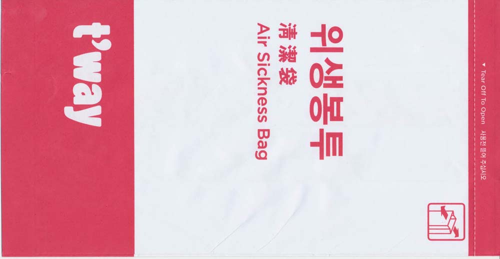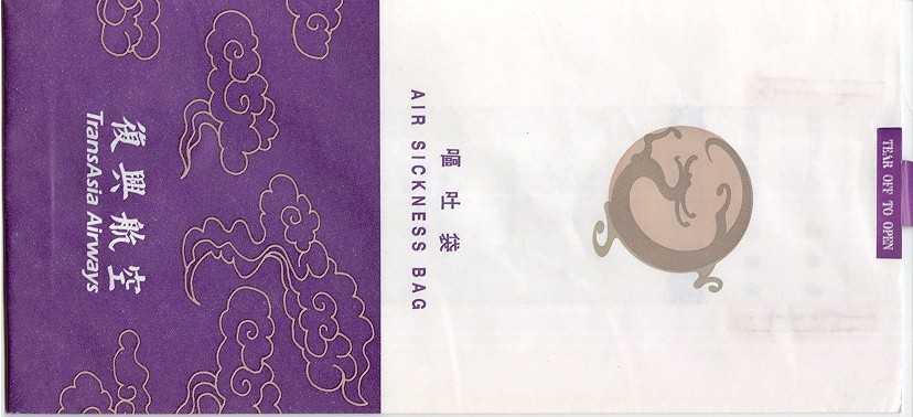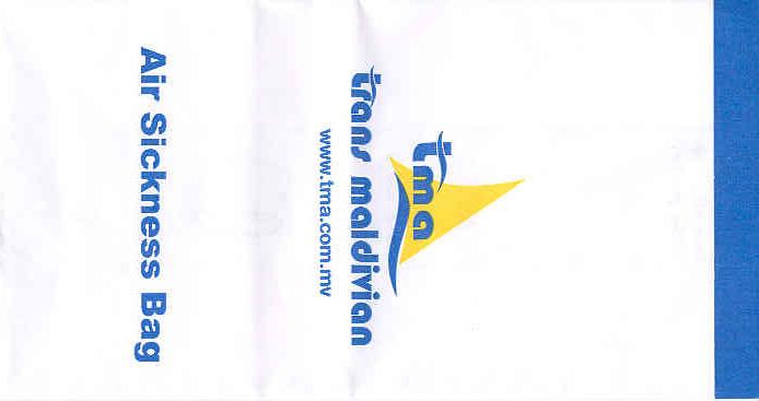 SmileA funny dog ready to puke on this tear-off-top bag. A low cost regional airline wholly owned by Thai Airways. Thanks to Frank Mulliri. TnuTnu is Thai domestic. Same design and refinements as the international Thai. Tear off top. Vertical closing wire. Thanks to Steve Jones. TransAsia Airways 1Beautiful bag from Taiwanese TransAsia. Nice artwork on front with Thai inspired color scheme. "Tear-off-to-open"-top. Graphic instructions on back with detailed folding instructions in two steps. Picture shows flat bottom bag but this is not! "Hand to stewardess" after folding procedure. I suppose TransAsia only hires female stewards? Thanks to Roger Macrae. TransAsia Airways 2A more simple bag as opposed to #1. pointy bottom and a "Fold dotted line". Thanks to Matthias Koch Trans Maldivian Airways 1A white plastic bag from TMA, Trans Maldivian Airways. Small bag with no closing mechanism. Logo in blue and yellow. Thanks to Gerhard Lang Trans Maldivian Airways 2New design from Trans Maldivian now with web address on the bag. www.tma.com.mv Thanks to Frank Mulliri Trans Maldivian Airways 3Changed design from Trans Maldivian now with web address and "Air Sickness Bag" in big letters. "Tear-off-to-open"-bag with folding instructions on back in English and another language unknown to me. Thanks to Massimo Nember. Uni