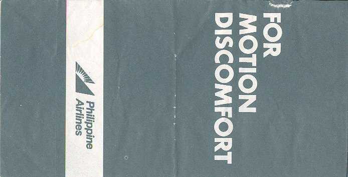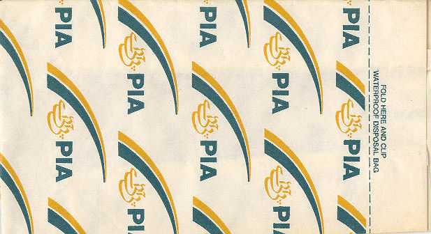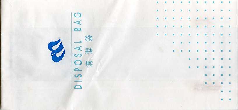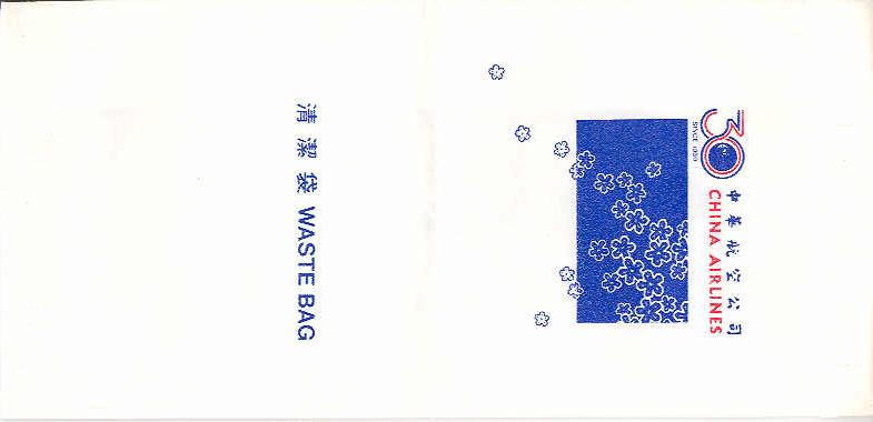5"Since 1959". This "waste bag" was issued to celebrate the Taiwanese airline 30 years in the air. Everything is printed up-side-down even the instructions on back. Two dotted folding lines. Thanks to Ronnie Irvine. China Airlines