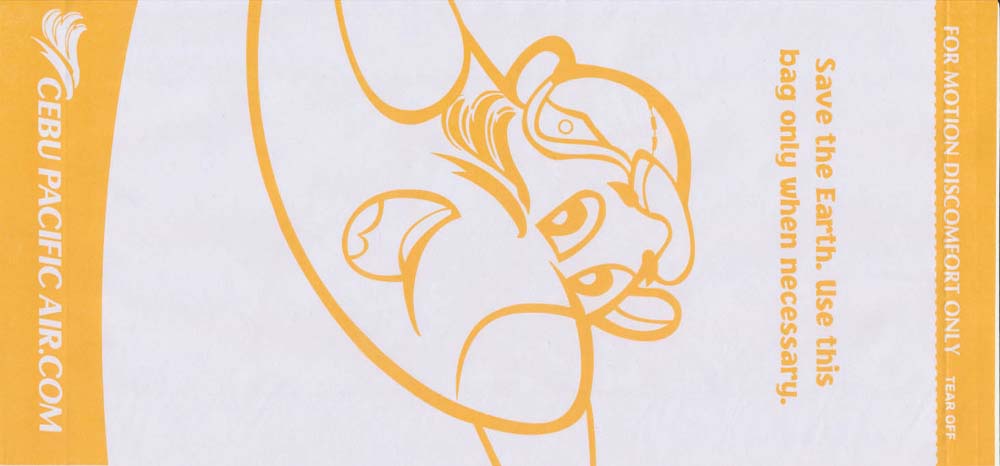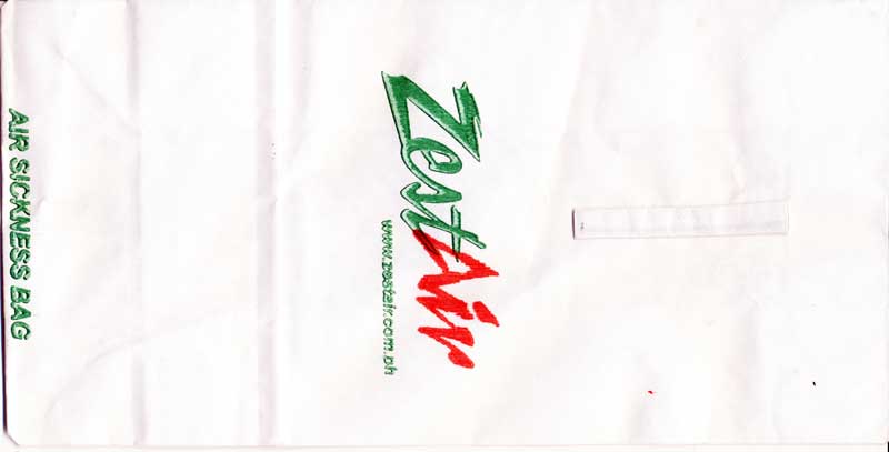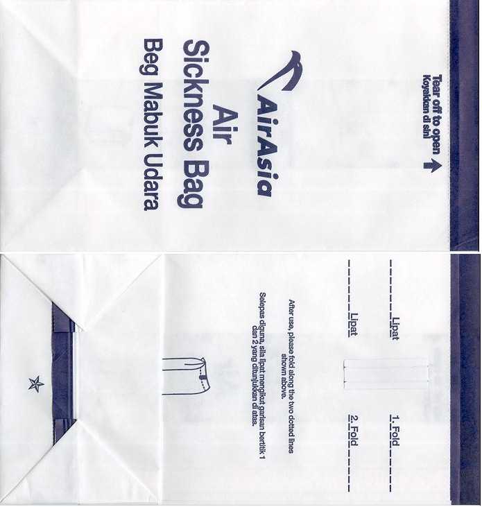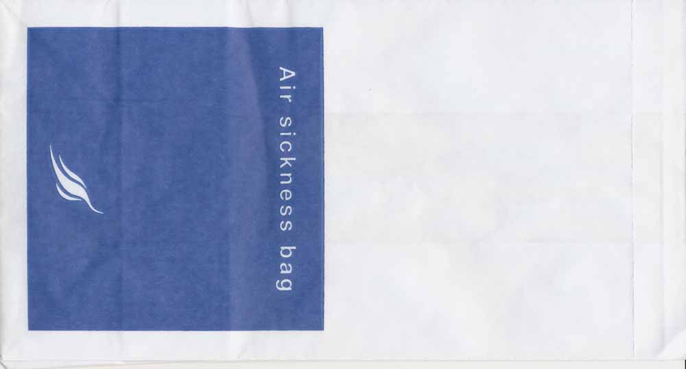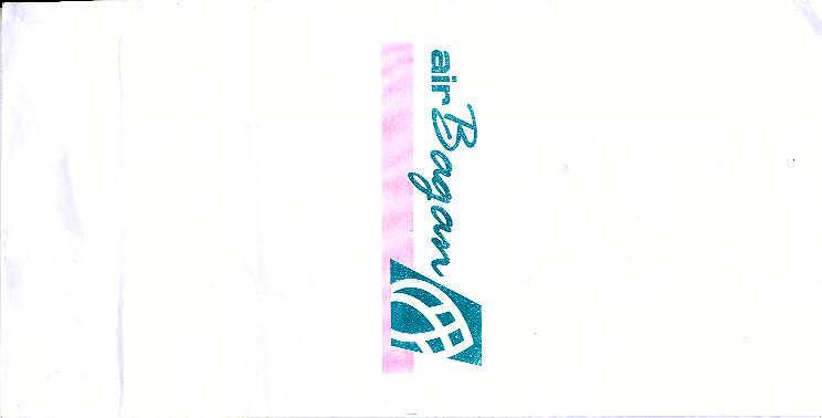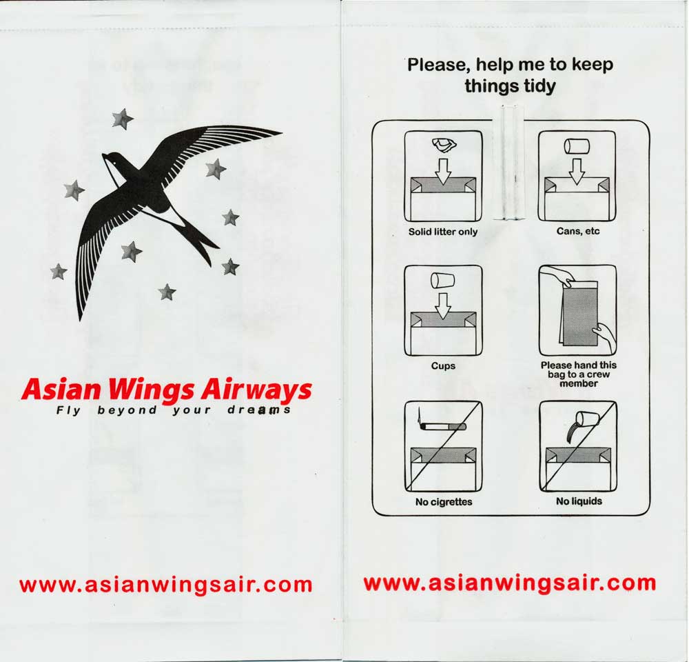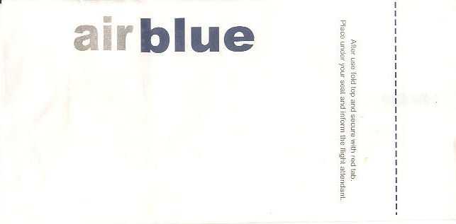 3AirAsia Berhad dba AirAsia is a Malaysian low-cost airline. It operates scheduled domestic and international flights and is Asia's largest low fare, no frills airline. Paper bag with flat base. Thanks to Vladimir Hlasny. Air BaganAir Bagan is an airline based in Yangon, Myanmar. It operates domestic scheduled services to 15 towns and cities, as well as to China and Thailand. Its main bases are Yangon International Airport and Mandalay Chanmyathazi Airport. A paper bag with a separate plastic bag inside, instructions on back only in Myanmar language. Thanks to Jan Tomášek. Air Blue"After use fold top and secure with red tab. Place under your seat and inform the flight attendant" probably same text in Pakistanian language on back. Thanks to Matthias koch Air