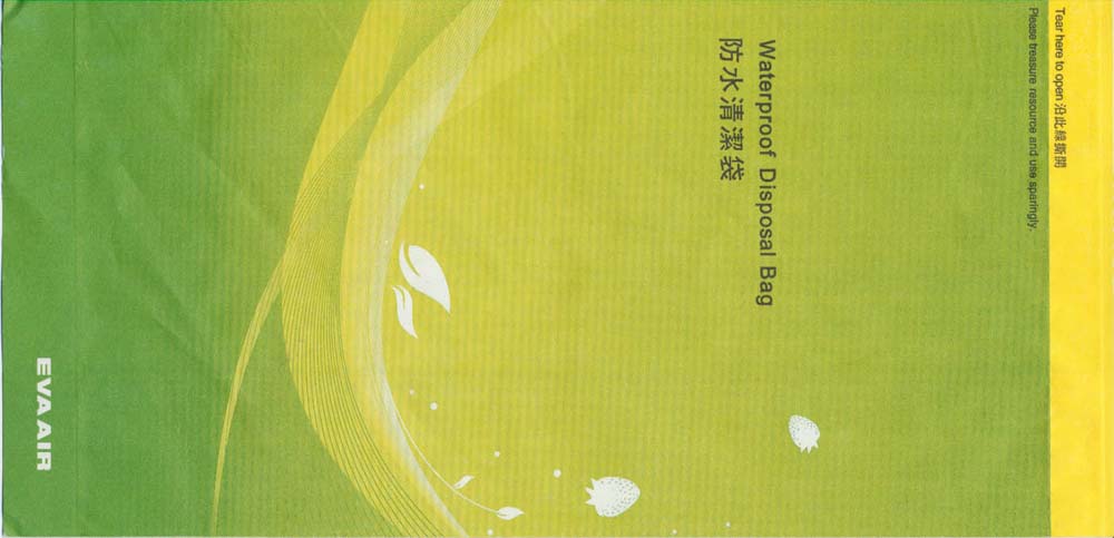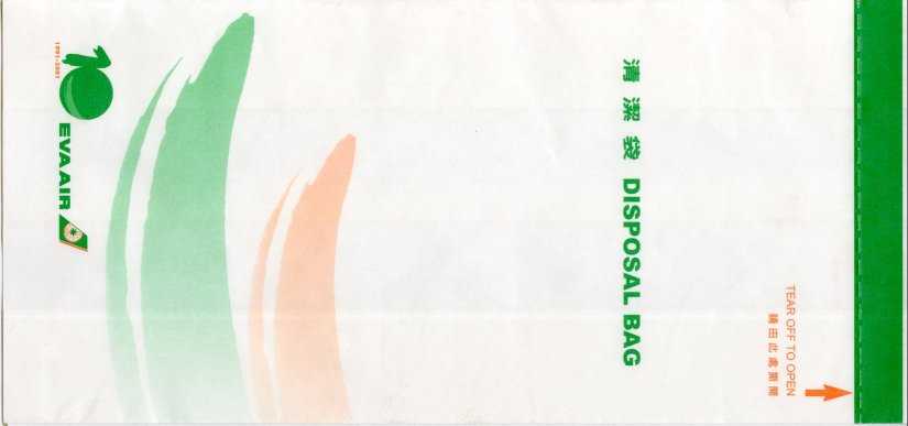 4A "Disposal bag" with "Tear-here-top" from Eva. Text in English and Chinese. Pointy bottom, no closing mechanism. Thanks to Guenter Pufler Eva Air