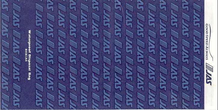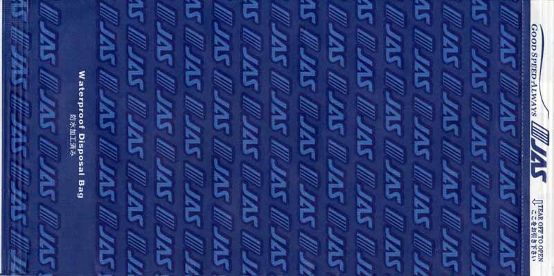 A-netSmart name from this Japanese airline, always first on alphabetical listings. Tear-off-to-open, flat base and "Waterproof Disposal Bag" in pleat. Thanks to Mark Wilson. Aero AsiaSmall bag from Pakistani airline Aero Asia. White bag with blue print "Friendly people, Friendly service". Vertical closing wire. Aero
