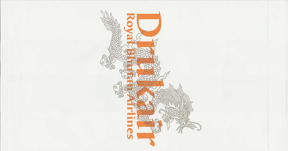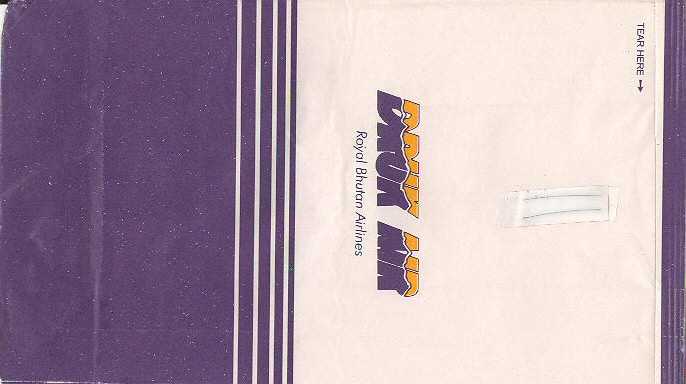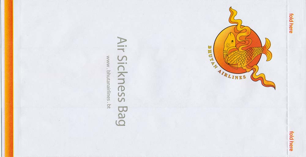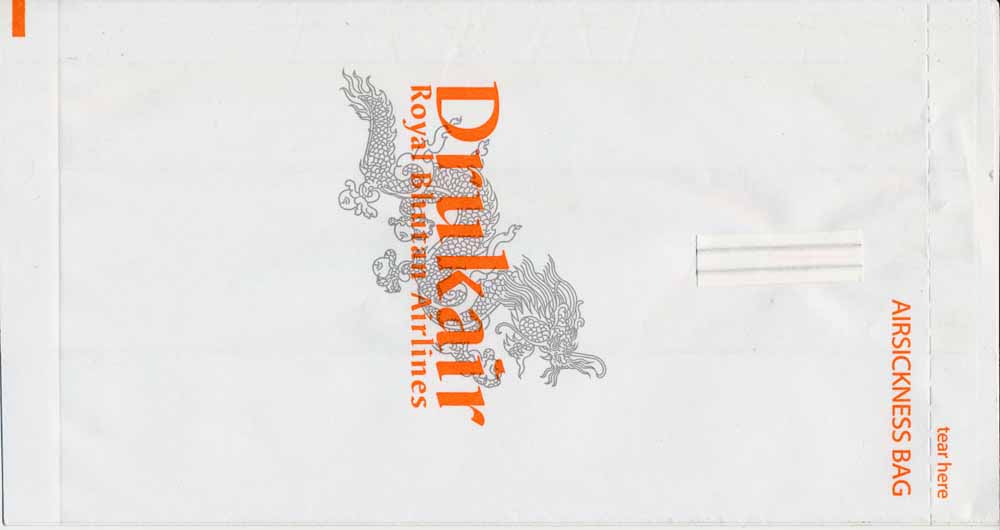 1A nice "Tear here"-bag from Royal Bhutan Airlines Druk Air. Vertical closing wire. Thanks to Roger Macrae. Druk Air