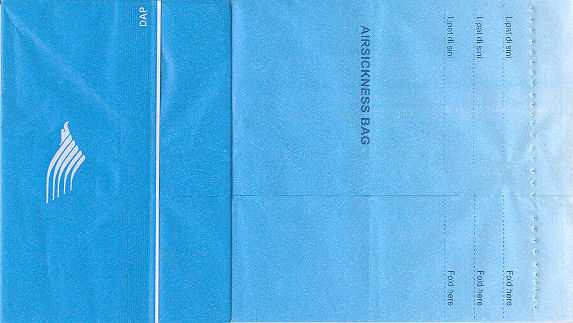 DOAir Do is a Japan based cheap airline. Established in 1998, it is an important airline of Japan. The airline maintains regular flight operations between Tokyo and various cities of Hokkaido. Thanks to Josef Gebele Air India 1Attractive red design from this big Indian international airline. Very robust construction with plastic coating inside and advanced closing mechanism. Manufactured by Creation in Mumbai - India. Thanks to Dhaval Chandra. Air India 2Beautiful decorated bag from Air India. Green and blue orchids all over the bag. Everything to ensure a very fresh puking session. "Air Sickness Bag" In English and Hindi. Thanks to Steve Silberberg. Air