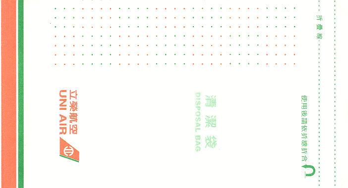 Air 1A "Disposal Bag" from this Taiwanese airline. Dotted folding line and "After use fold toward you". Star in pleat. Thanks to Senno van der Velde. Uni