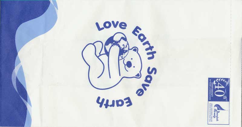 7A 40th anniversary bag from Thai Bangkok Airways. "Love Earth Save Earth". URL to flyer bonus website on base. Tear off to open and vertical closing wire on back. Thanks to Josef Gebele. Bangkok Airways