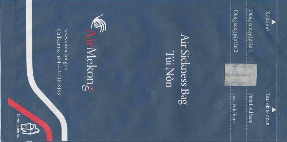 2Air Mandalay is a young airline based in Myanmar (former Burma). Bag with flat base and airline URL in pleat. Thanks to Thomas Ansorge. Air MekongVietnamese Air Mekong with a dark blue "Tear off to open" bag. Vertical closing wire and folding instructions on front and back. Bag maker information in pleat. Pointy bottom. Thanks to Jan Tomášek. AmedeoA gray bag from a Brunei airline with the exiting name "Amedeo Corporation SDN. BHD". High quality bag with sturdy paper, plastic coating inside and horizontal closing wire. "After use fold toward you". Thanks to Fredy Thuerig. ANA 1A bag in discreet light gray from the Japanese ANA. Instructions how to open the bag in English and Japanese! Also the text. "Waterproof Disposal Bag" in both languages. A decorative checker pattern stripe goes round the bag. ANA 2A "Waterproof Disposal Bag" from Japanese All Nippon Airwais (ANA). "Tear-off-to-open"-top and instructions in Japanese and English. Thanks to Bruce Kelly. ANA