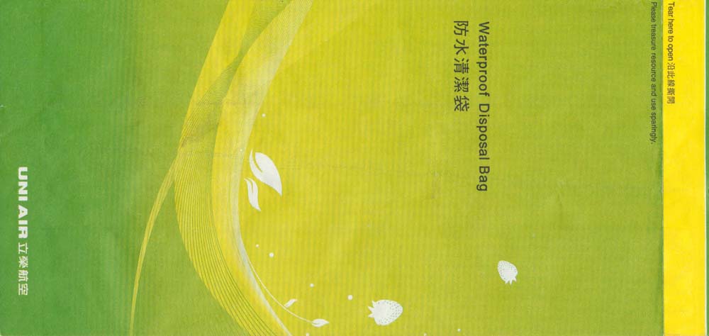 Air 2A "Disposal Bag" from this Taiwanese airline. Dotted folding lines on both sides. Instructions in Chinese and English. Thanks to Matthias Koch. Uni