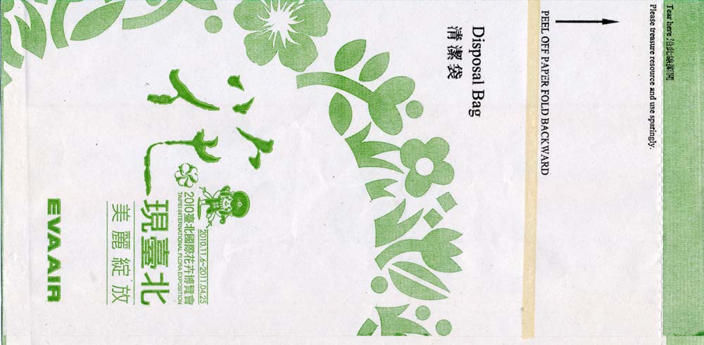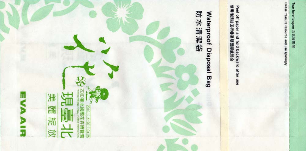 5A "Disposal bag" with "Tear-here-top" from Taiwanese Eva. Text in English and Chinese. Pointy bottom, no closing mechanism. Thanks to Thorsten Hecht Eva Air