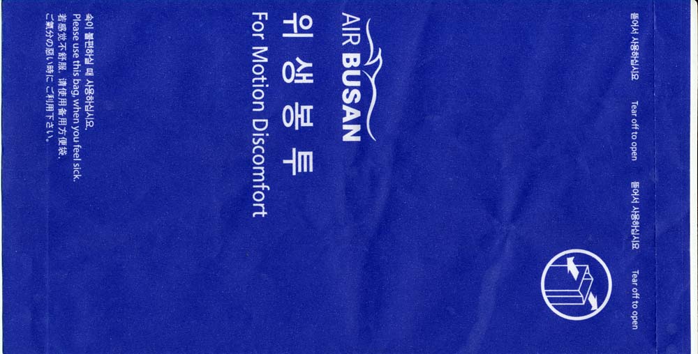 BusanAir Busan, a low cost carrier of South Korea. All blue tear-off-top-bag with instructions in four languages. Thanks to Vladmir Hlasny Air
