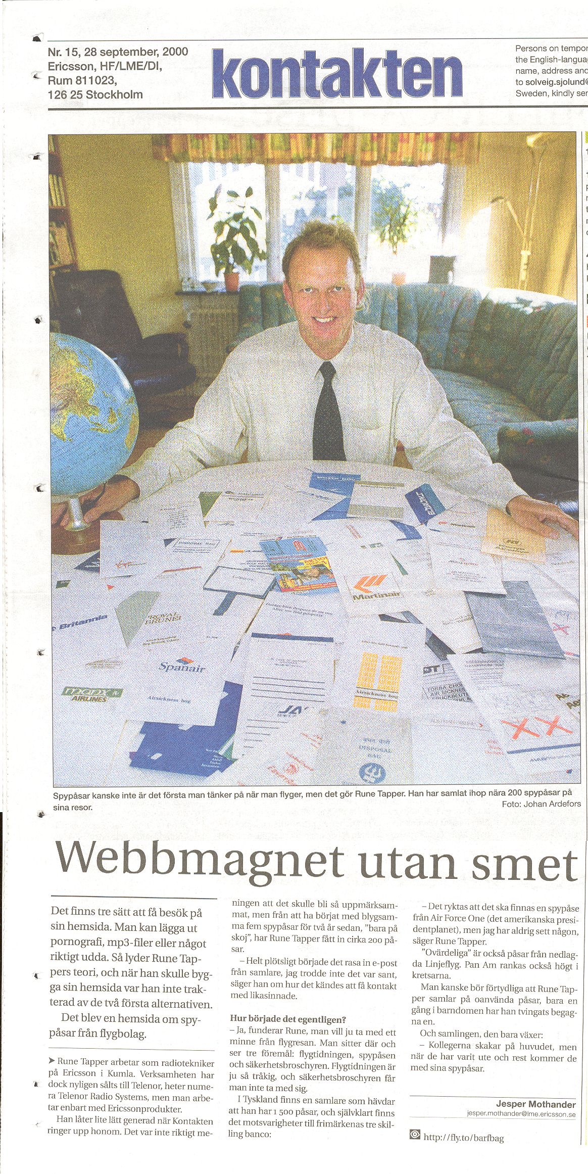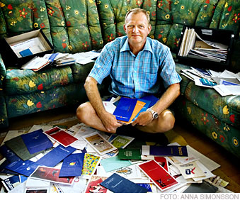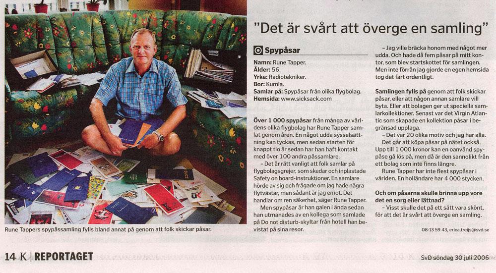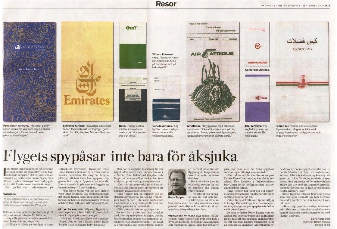 Website stays clean There are three ways to get people to visit a website. You can either include pornography, mp3 files or something really strange, at least according to Rune Tapper's theory. When he constructed his website, he wasn't attracted by either of the first two alternatives. Instead, he decided to made a website about airline vomit bags. Rune Tapper works as a radio technician at Ericsson in Kumla. That operation was recently sold to Telenor, however, and is now known as Telenor Radio Systems, even though the company works exclusively on Ericsson products. He sounds almost a little embarrassed when Contact calls him up. It wasn't really my intention that there would be so much attention, but after starting out with a mere five vomit bags two years ago, "just for fun," Rune Tapper now has around 200 bags. "Suddenly e-mail started pouring in from collectors. I couldn't believe it was true," he says about how it felt to be contacted by similar-minded people. How did it really start? "Well," says Rune contemplatively, "you want to have a souvenir from your plane trip. You sit there and see three things: the airline magazine, the vomit bag and the safety brochure. The airline magazine is really boring and you're not allowed to remove the safety brochure. In Germany, there is a collector who claims to have 1,500 bags, and sure there are rarities, just like in stamp collecting. "Rumor has it that there is a vomit bag from Air Force One (the American president's plane), but I have never seen any," says Rune Tapper. Bags from the former Swedish Linjeflyg airline are "priceless." Pan Am bags are also highly valued among the ranks of collectors. One should perhaps clarify that Rune Tapper collects unused bags. He has only been forced to use one once, when he was a child. And his collection just continues to grow: "My colleagues just shake their heads, but when they have been out traveling, they bring me their vomit bags." Jesper Mothander