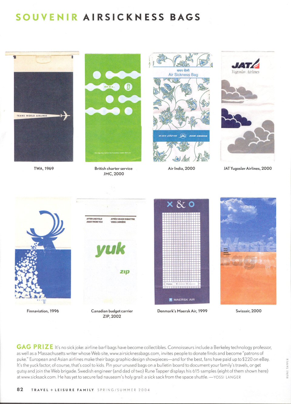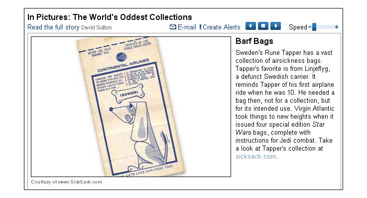 Clip from the article: And collecting isn't just an American pastime. Kumla, a small town in central Sweden, is the world capital when it comes to airsickness bags. It took 15 years for Rune Tapper, a radio engineer, to acquire more than 1,200 barf bags from 474 airlines in 133 countries, which he showcases on his Web site, sicksack.com. "I must be alone in the world collecting barf bags," he says in an e-mail. "You can't imagine how surprised I was when mail started pouring in from other collectors around the world with bag donations and requests for bag swapping." Some